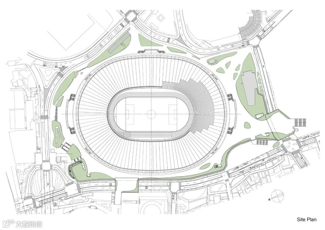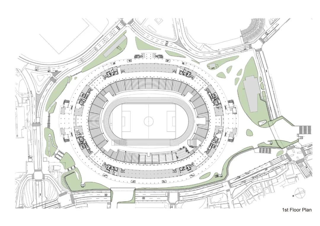 带有日本特色的体育场,与周围的明治神社森林融为一体——新国家体育场的外观与多层“屋檐”融为一体。屋檐是日本传统建筑的组成部分,是植根于日本气候的既定结构。它们阻挡阳光,为看台带来宜人的微风,为创造环境友好型建筑做出贡献。