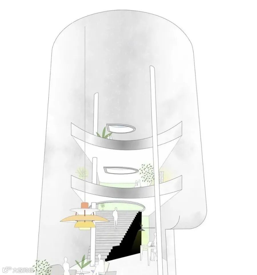 该塔的设计通过对基础、轴和柱头的连续抽象来模拟柱子的压缩和延伸。这座首都被表达为一个飞行阳台和贝壳曲线的屋顶日光浴平台,游泳池和“浴室”水疗中心。
