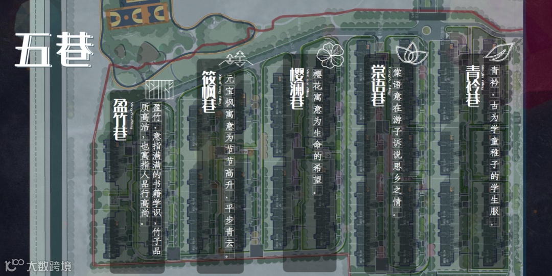 该项目结合整个地势特点,通过天然的台地高差设计打造立体折叠景观,定制5个组团,并且每条巷道设计特色主题,对应选择不同的景观植物来打造,同时再提取这些植物的元素符号,加以精细化设计,可以说是细微之处非常用心了,这样的景观动线为客户打造了私属空间,强化私密性,并且更加强化了归家礼序,整体富有更好的层次感与节奏感。