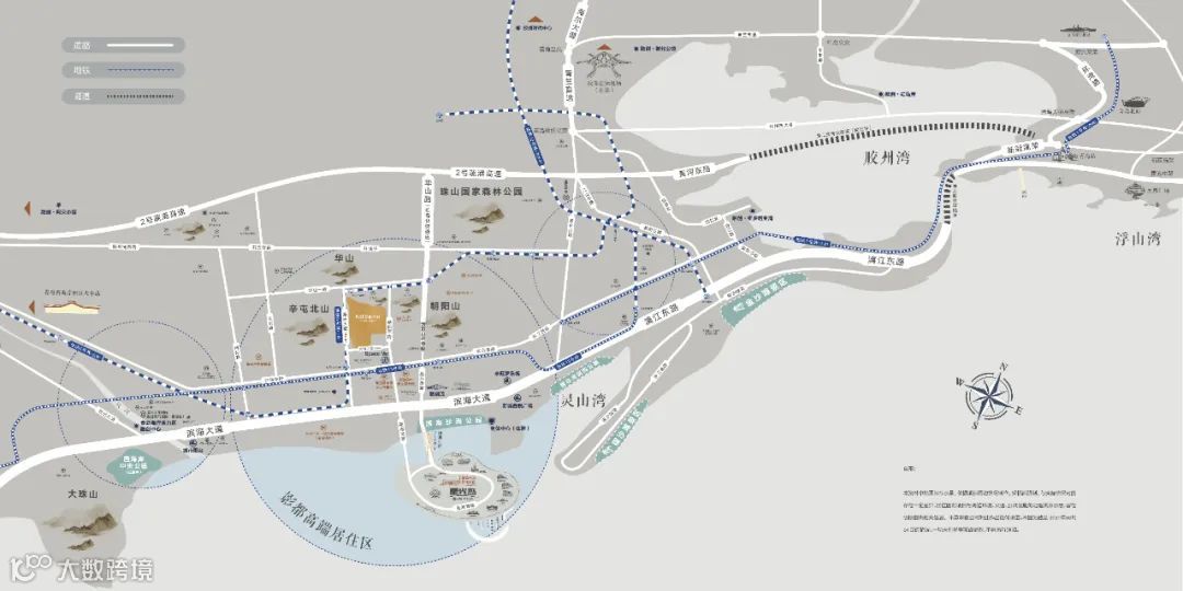 项目位于西海岸灵山湾核心中轴,在青岛282km海岸线上,背山面海,为“太师椅”风水格局。