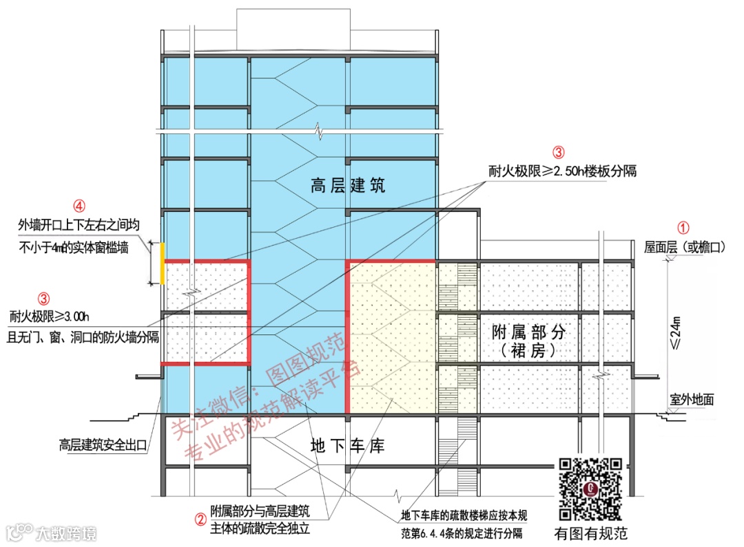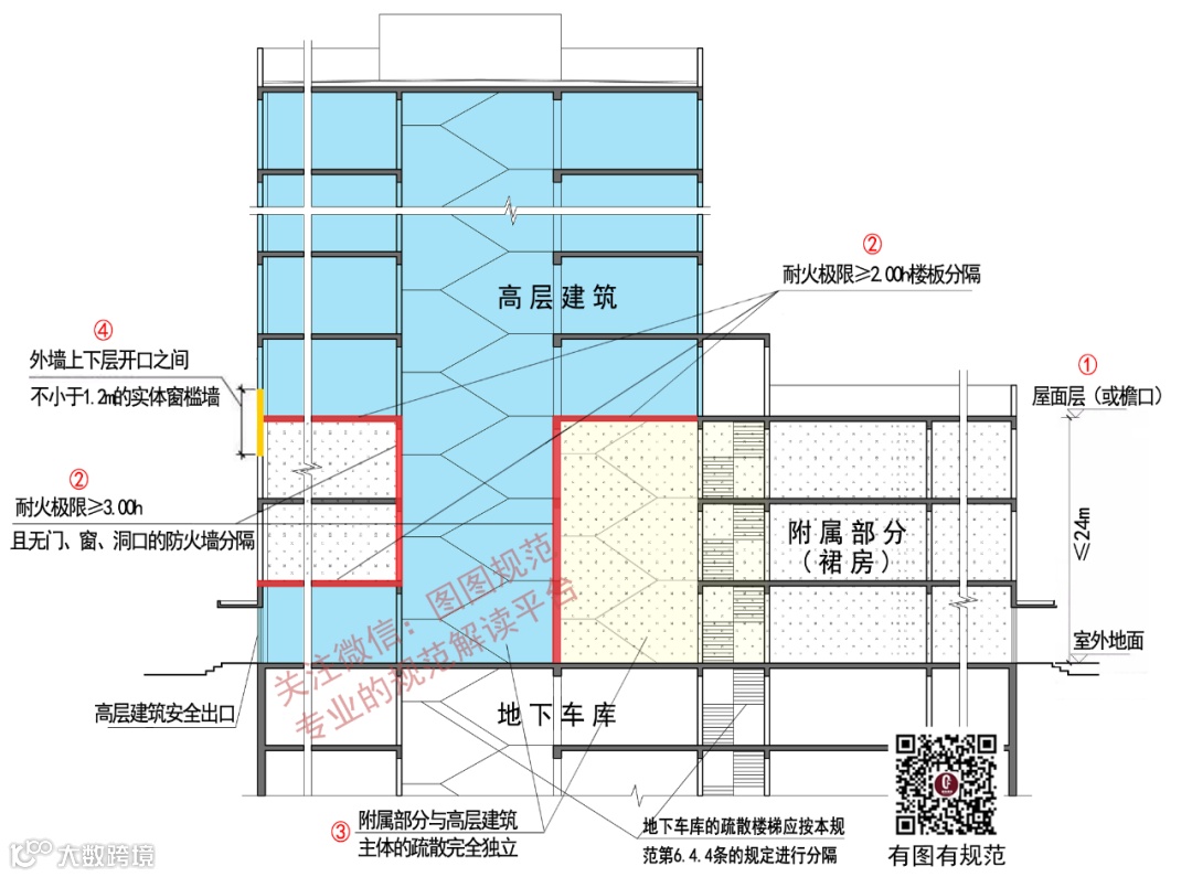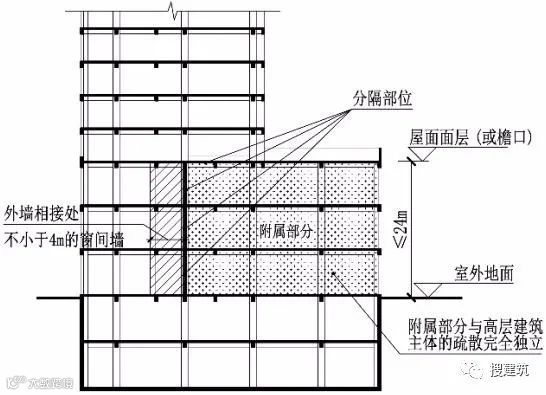 当附属部分同时符合下列1~4款规定时,主体建筑与附属部分的安全疏散、消防电梯和防火分区的设置可根据各自的高度分别按规范执行:(附图1.5.3)