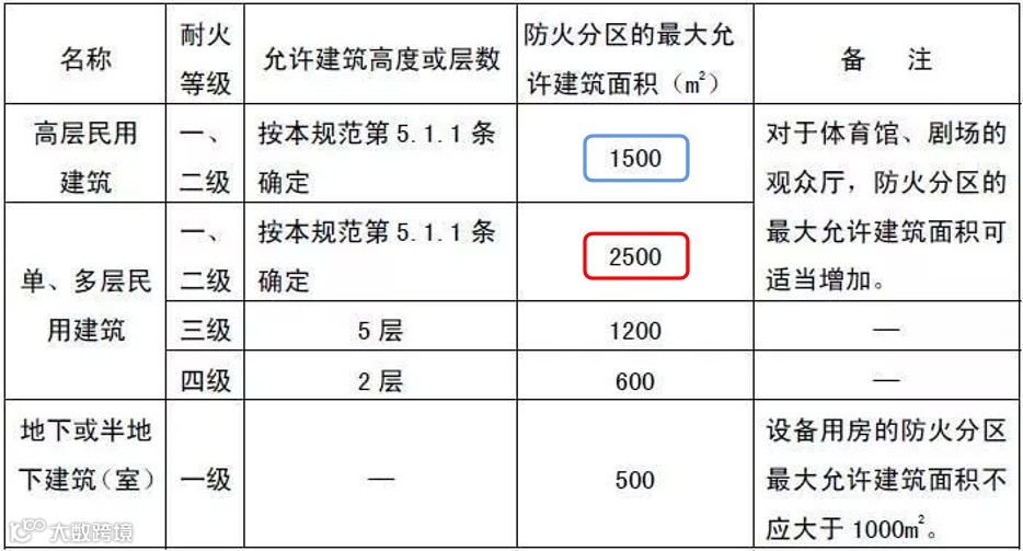 现按单、多层居用建筑要求,防火分区最大允许建筑面积可以达到2500㎡。