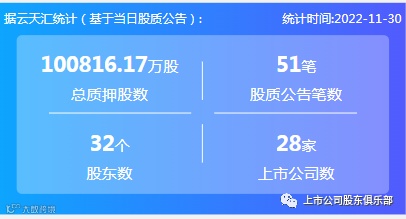 2022年11月30日,股票质押总质押股数100816.17万股,上市公司数28家,股质公告笔数51笔,股东数32个。
