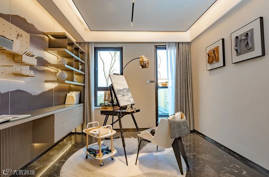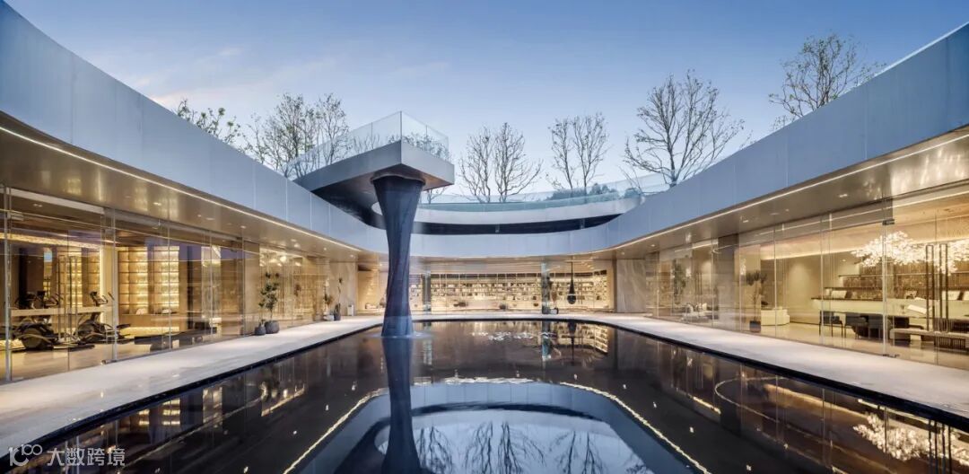 环形走廊四周是360度的落地玻璃窗,往室内延展了多种配套功能,健身中心、书吧、会客厅、影音室等。