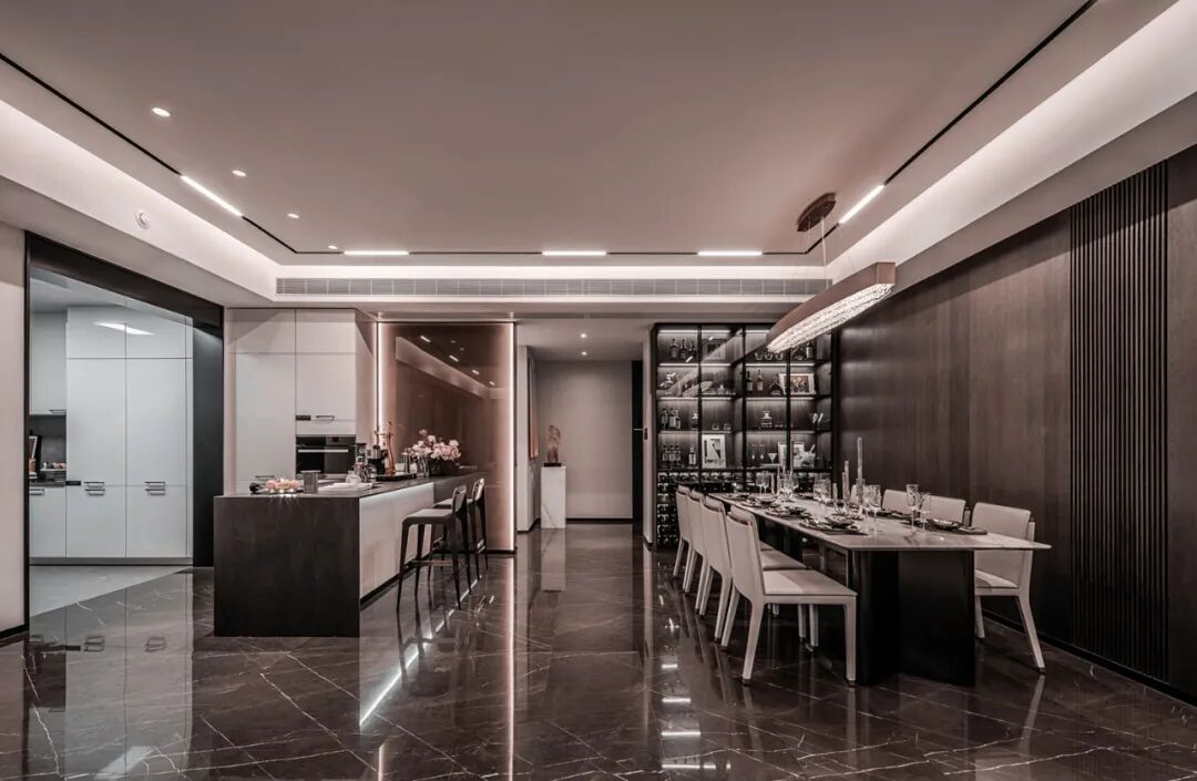 餐厅是最具仪式感的存在,。精致优雅的黑白色调搭配极简陈设组合而成的家具,克制内敛,星星点点的装饰光源,品质器具在推杯换盏间氤氲出现代美学气息,为平实的生活注入仪式感。