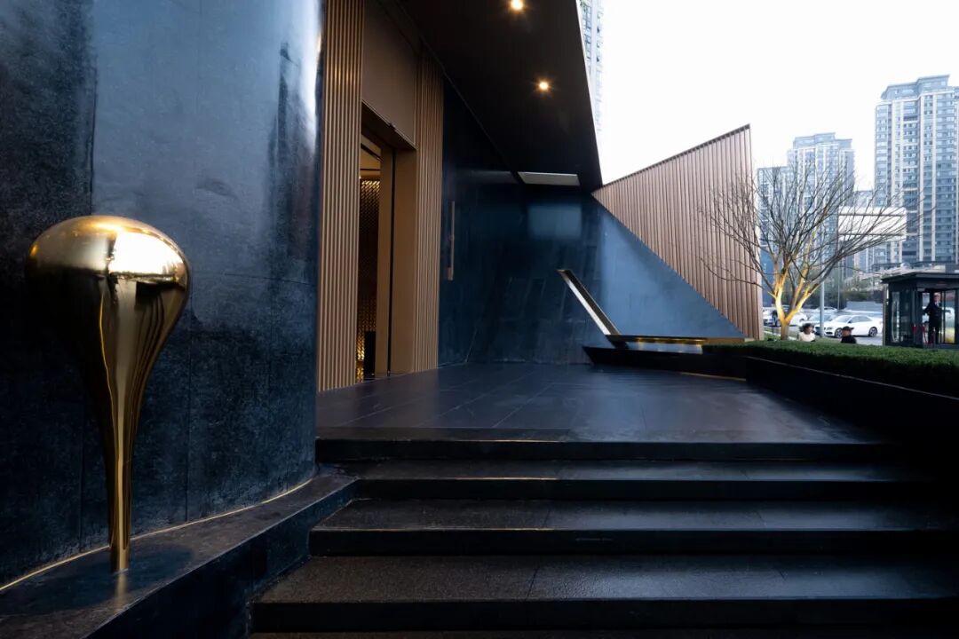 街道转角的电梯厅入口,是礼遇的开始。黑色皮革面石材与亚光金属,在黄色系背景下独具一格。隐藏在水台后的婉转台阶,半掩在倾斜的格栅与植物后的入口,两颗水滴雕塑悬在展开的画框中,半开半合,以神秘感吸引人探寻,再以亲和的姿态迎接来客。