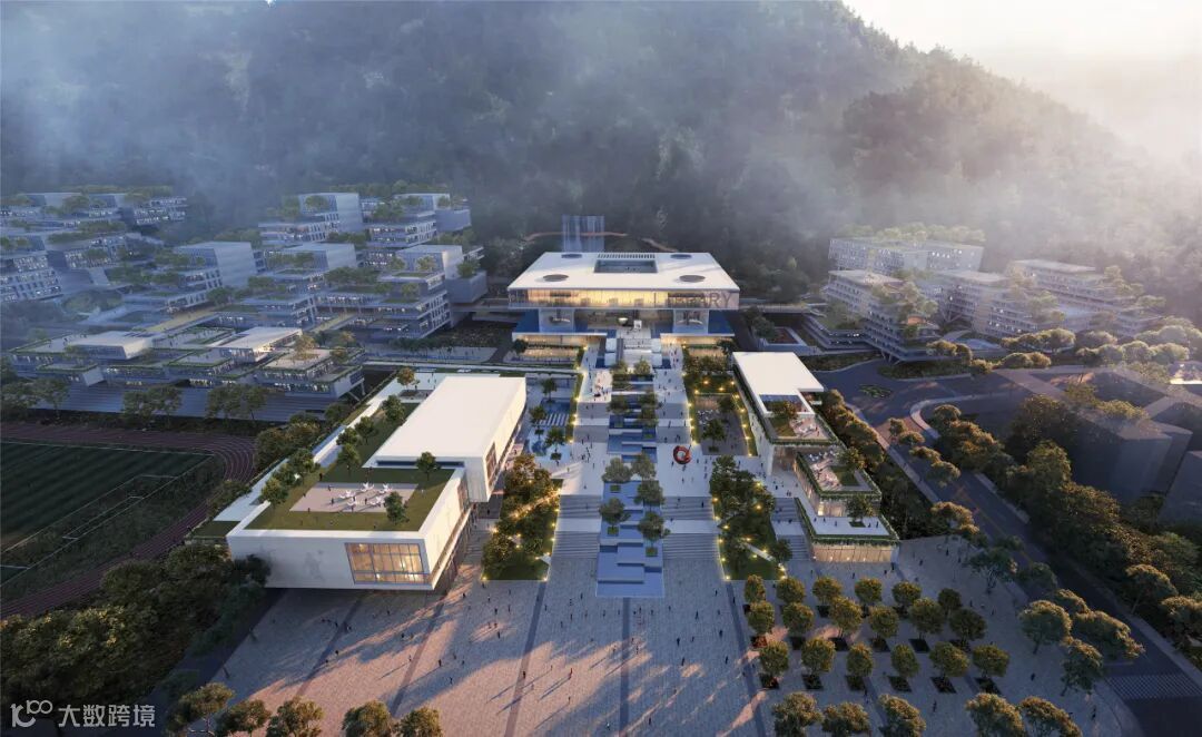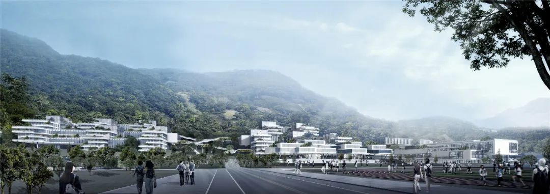 校园内建筑组群的布置,力求达到建筑与环境的共生及使用的高效。设计中,通过集中与分散相结合的方式,一方面使建筑相对聚集,减少对山体的侵占;另一方面,使建筑顺应山势适度拉开距离,实现建筑与山地景观的融合。