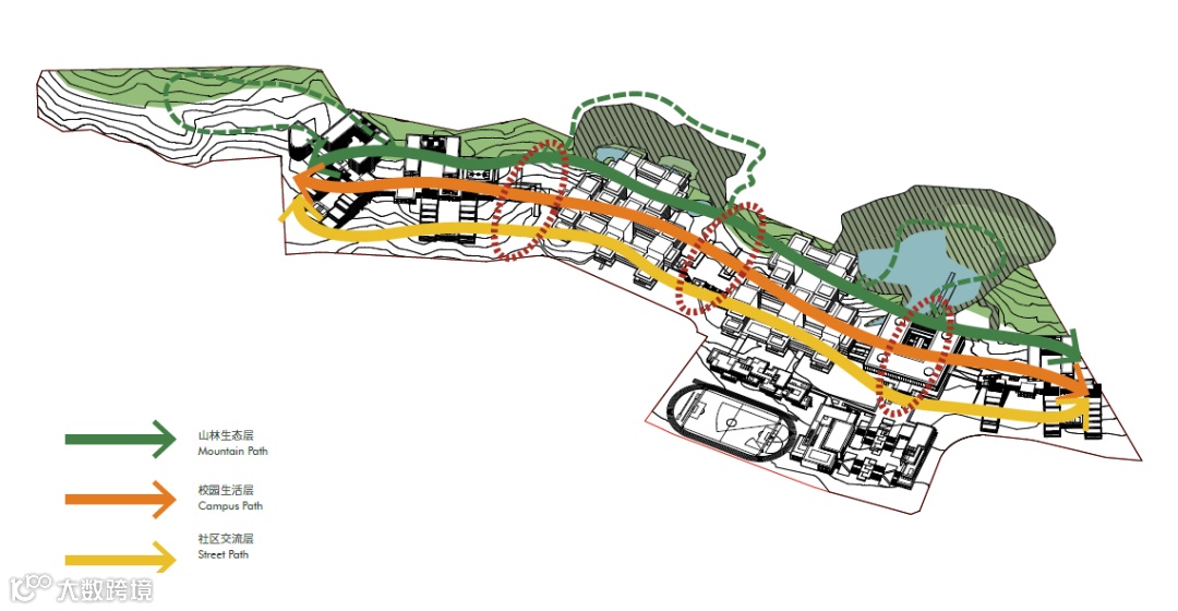 由于山地地形的变化削弱了校园道路的连贯性,所以设计根据场地特点及对外交通联系,采用灵活的方式,设置三层交通体系,分别为山林生态层、校园生活层和社区交流层。三层交通相辅相成,共同打造高效丰富的校园通行体验。
