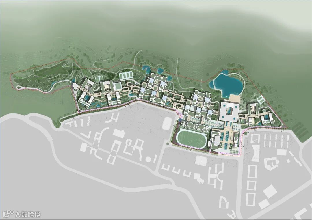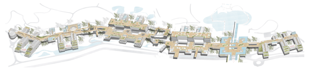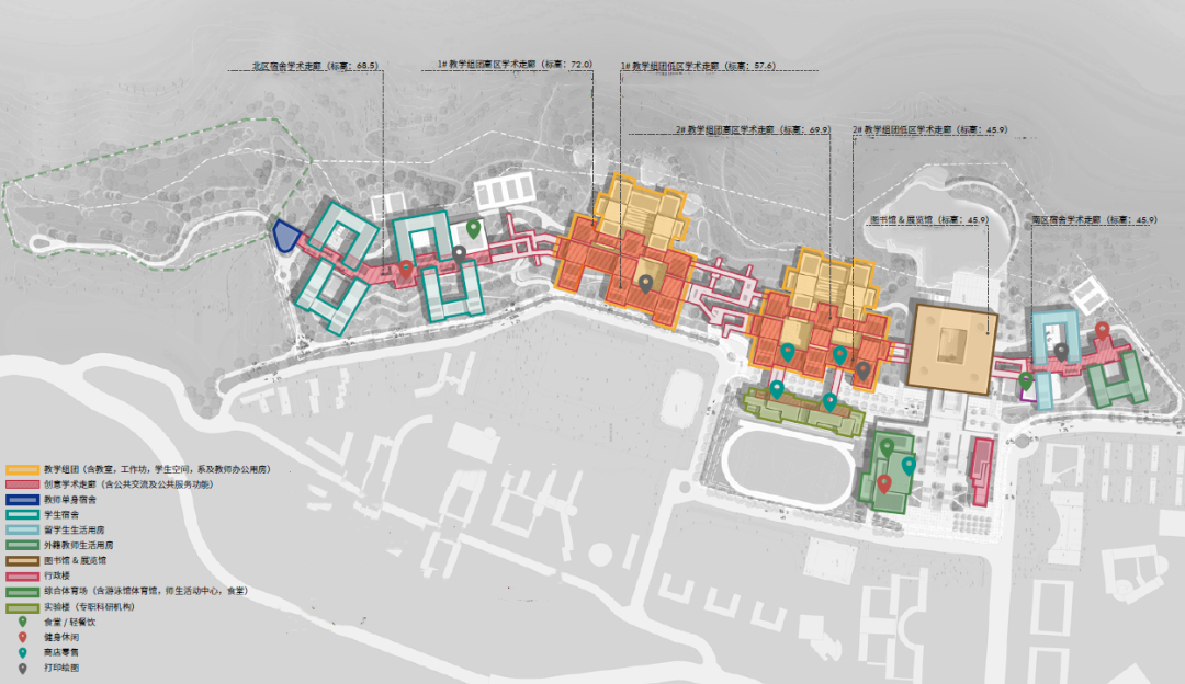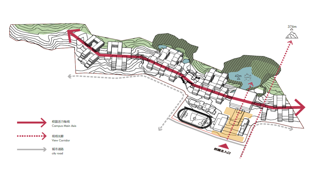 根据山势分水线、汇水线,确定适宜建设的范围,并依山体走向,规划校园活力轴线——创新学术走廊,高效组织教学区、生活区和体育活动场地等。创新学术走廊是一个标志性的线性连续空间,空间灵活,室内外交错,承载着多重使用功能。