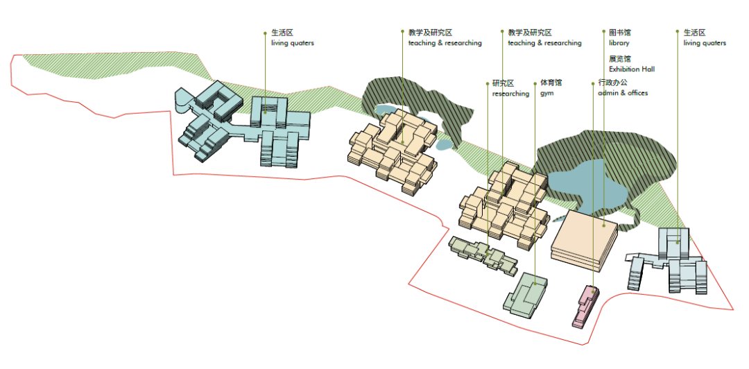 校园功能区域的划分依功能特点与地貌特征,以实现整体协调,建筑采用底层架空的方式,以减少对地表生态的影响。