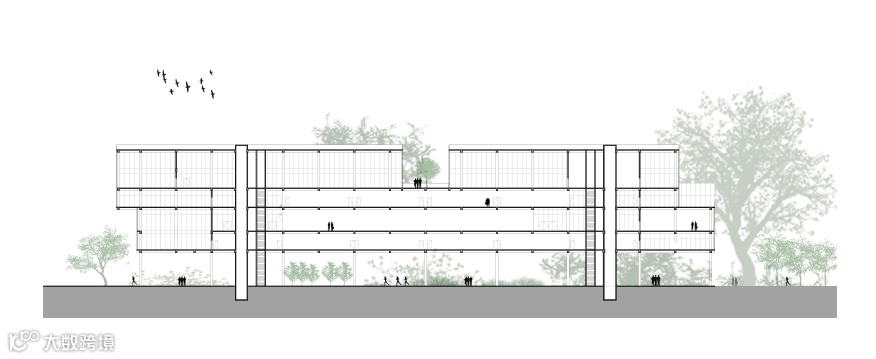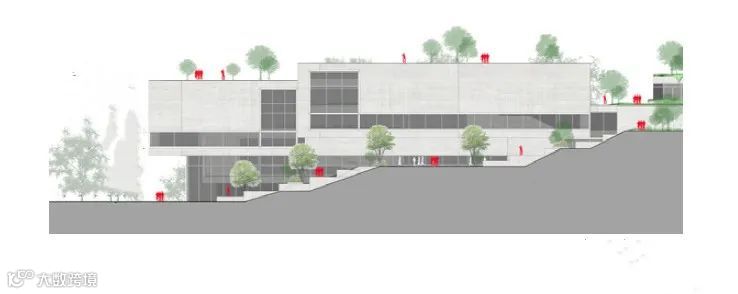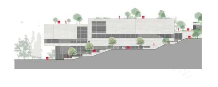 建筑采用架空的方式,以保持基地原有的生态,在建筑低层塑造丰富的环境界面,并且形成不同标高的多层次山地空间。
