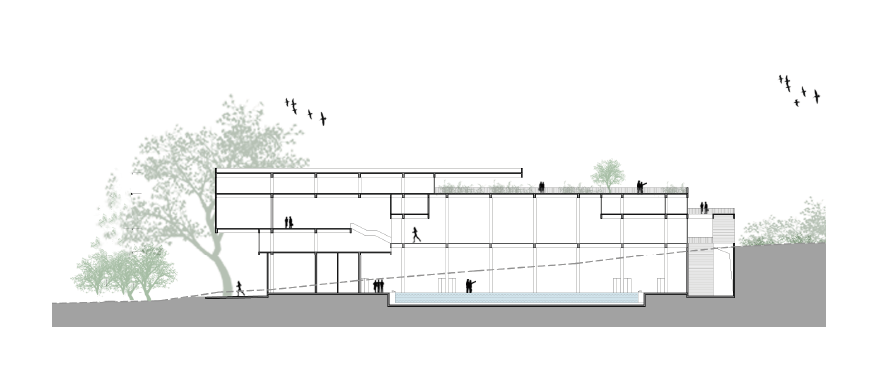 为了避免建筑接地面的方式与山地的原生态环境产生不利影响,设计过程中,我们尝试了大量剖面设计,以验证建筑生态合理性,避免出现大量的土方开挖和生硬的挡土墙。