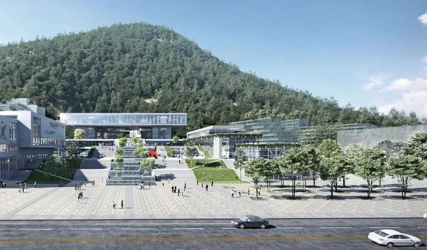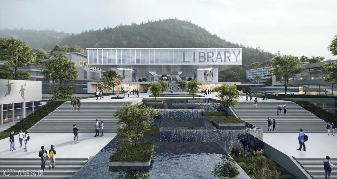 主入口处,以图书馆作为轴线端景的大尺度长方形空间,配合地形变化远眺山顶,让绵延无尽的自然地景成为创意永恒的象征。