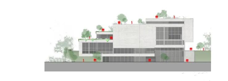行政楼位于入口空间的南侧,结合入口台阶广场,层层退台,形态凸出,使空间和建筑形态丰富,更好地与凤凰山景观相融合。