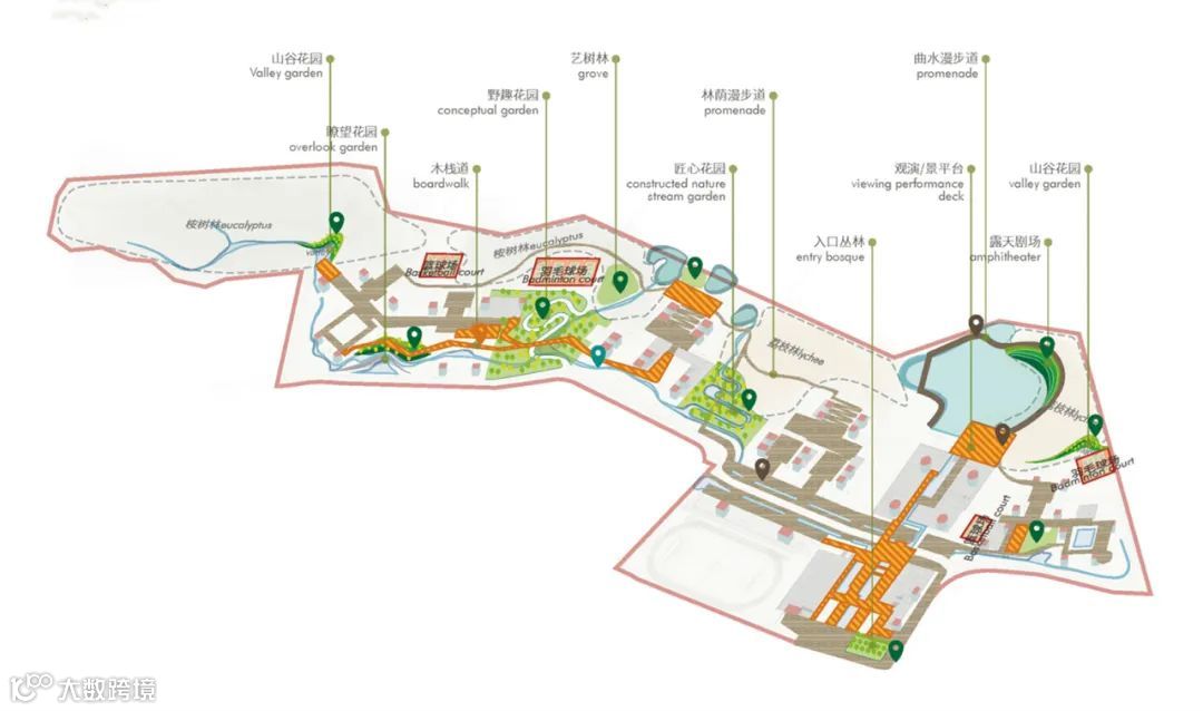 保留主要水域,沿汇水线设计景观水道;雨季可用于泄洪;非雨季呈现旱溪景观,与交通体系相映成趣,迎合地表生态。