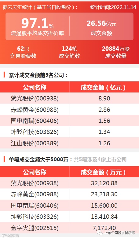 2022年11月14日,大宗交易成交金额26.56亿元,交易股票数62只,成交笔数124笔,流通股平均成交折价率97.1%,成交数量20884万股。