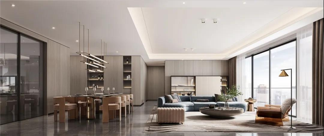 如约115㎡的户型做到了面宽约6.6m的约40㎡的宽厅,将公共区域更大程度的组合在一起,增加室内空间感的同时,也丰富了双厅的场景应用;
