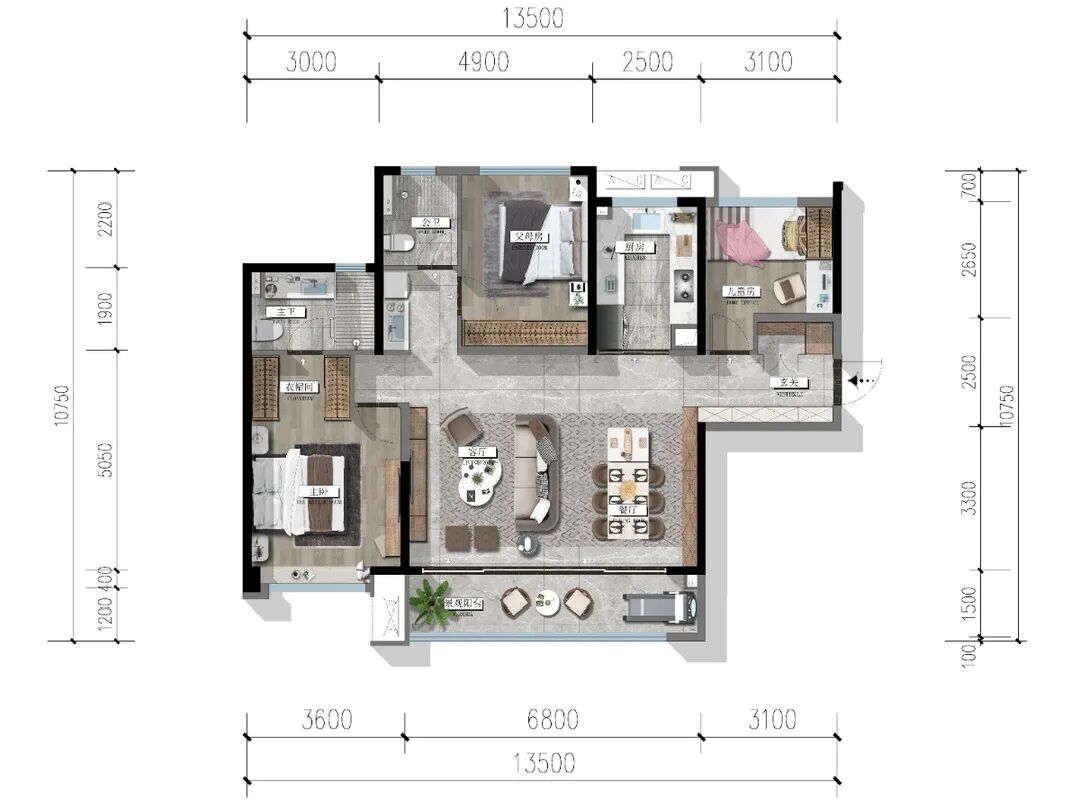 约5.8m×5.7m的主卧包含独立玄关、独立衣帽间+化妆间、独立卫浴间、具功能性的超大飘窗等等配置,充足的空间为卧室承载更多生活场景提供了可能性,且尺度感超强,让居住品质得到真正的提升。