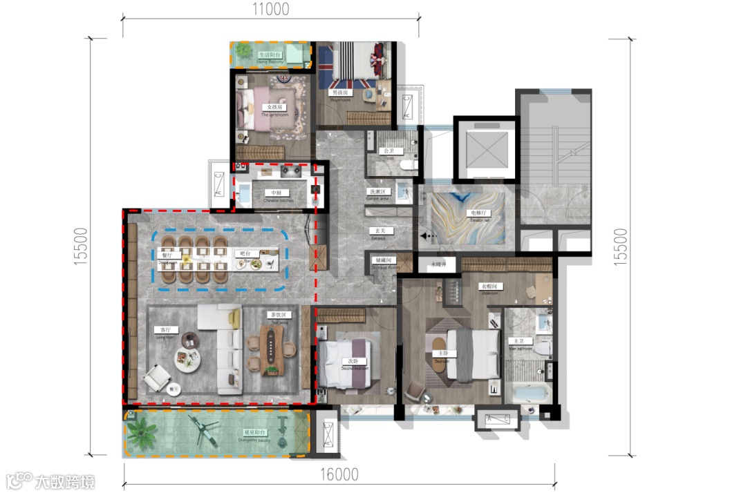 1、LDKB超大方厅,以餐厅+岛台为生活核心,更加强调社交化