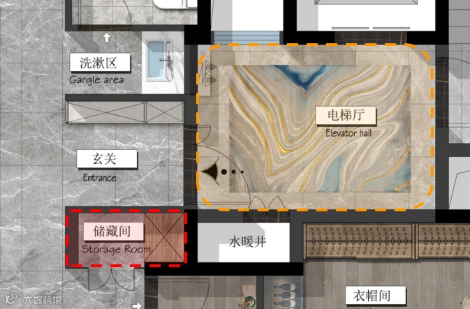 该户型独立电梯间、独立玄关、储藏间的设计,可以提升居住私密性,更具有仪式感和尊崇感,并能够拥有足够的收纳存储空间,居住的实用感与品位感皆可满足。