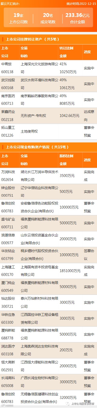 2022年12月15日,资产交易成交金额233.36亿元,上市公司19家,成交20笔,上市公司挂牌转让资产5笔,现金收购资产15笔。