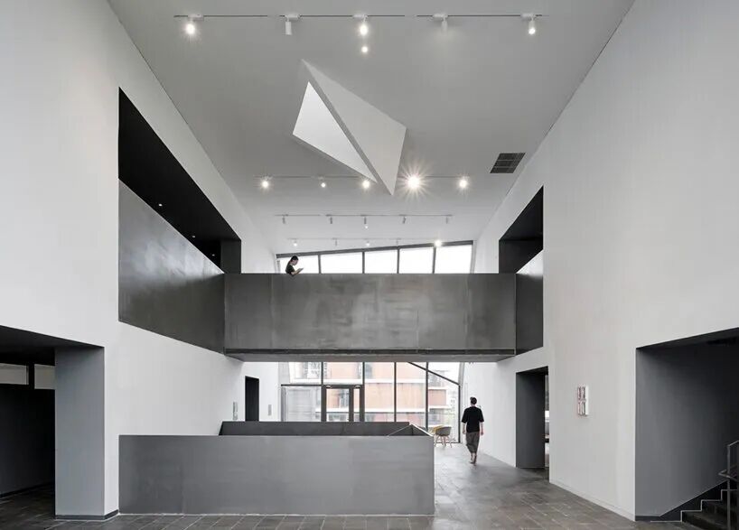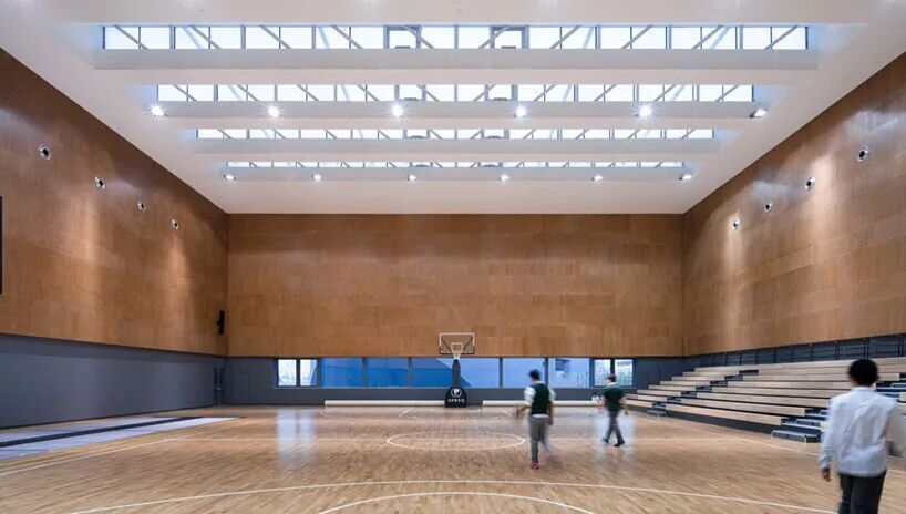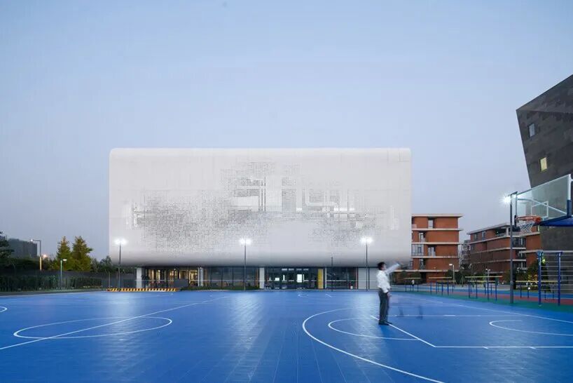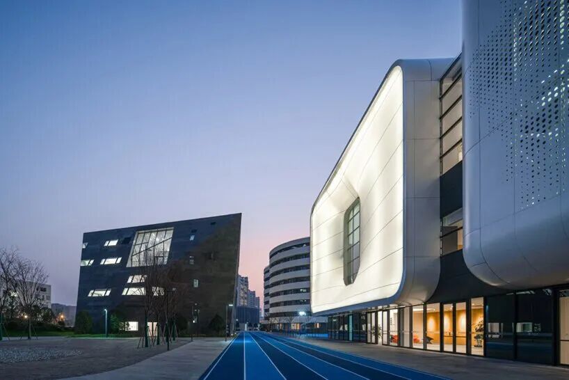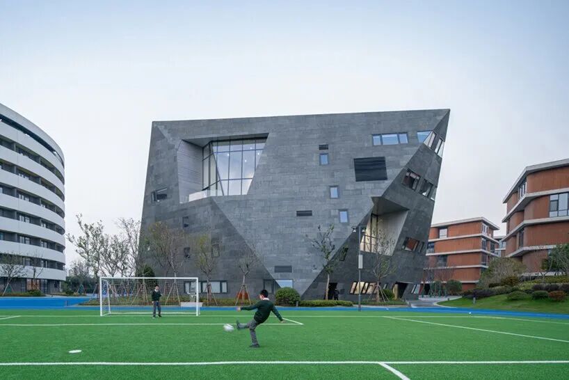 OPEN architecture designs its ‘qingpu pinghe international school’ campus in shanghai as a constellation of buildings, each unique in its design language and function. the buildings are linked by thoughtfully designed landscape elements, is a direct response to the widespread prevalence of over-scaled, generic school complexes in china. among the school’s diverse building types — including learning cubes, an administration and laboratory building, a helical student dormitory, and a freeform kindergarten — are three core elements. these elements, respectively representing reading, sports, and art, the essential components of contemporary education, are dubbed the bibliotheater, gym canteen, and the arts center.