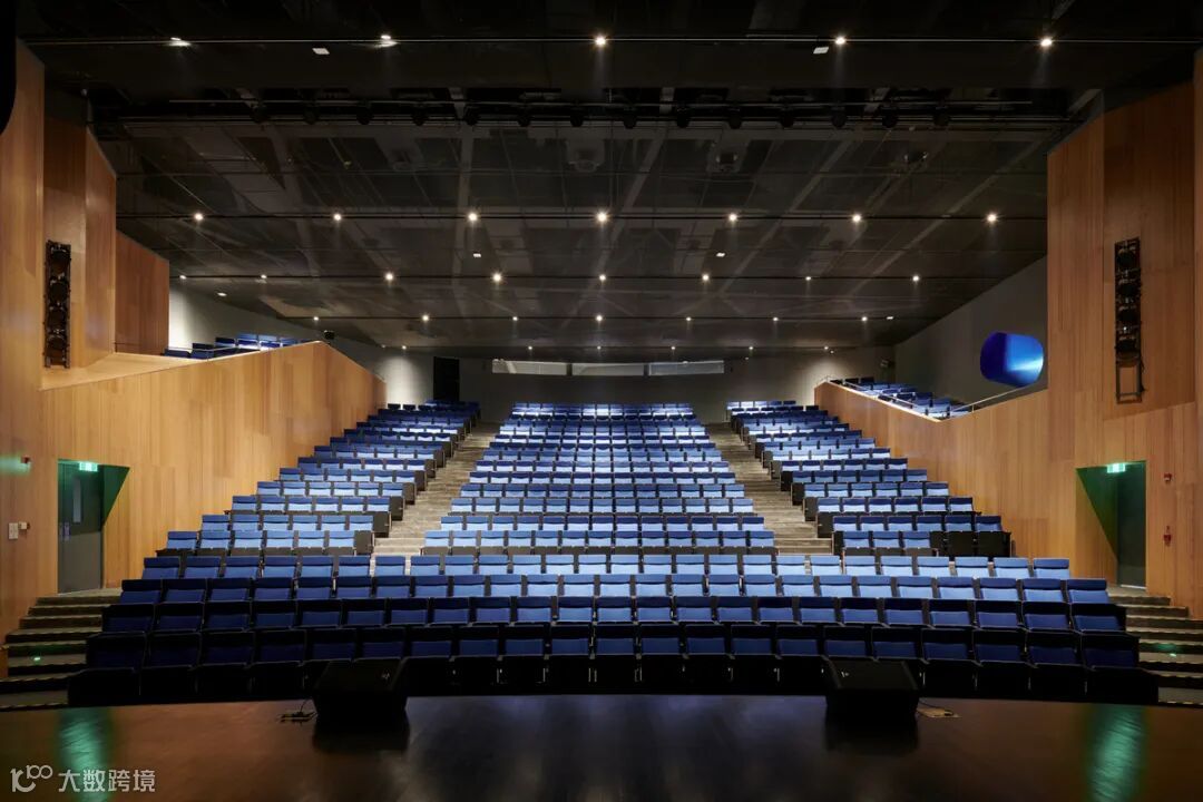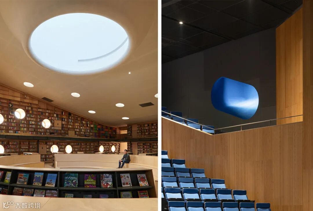 这座建筑中包括一个图书馆、一个专业剧场和一个黑匣子剧场,内部空间如搭积木一般紧密契合在一起。其倾斜的屋顶和醒目的蓝色外观让人过目不忘,有人说像一头蓝鲸,也有人说它像一艘巨轮。我们相信阅读和表演是早期教育的两个至关重要的组成部分,于是将图书馆和剧场并置。