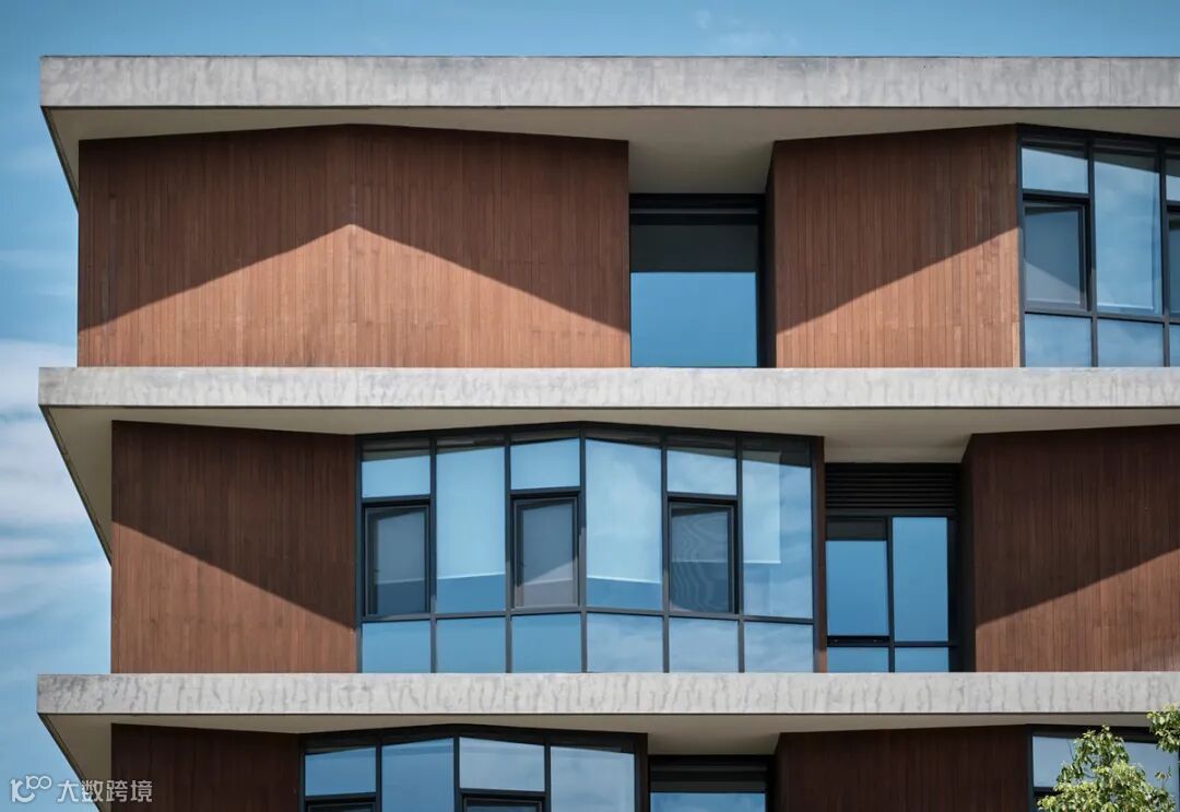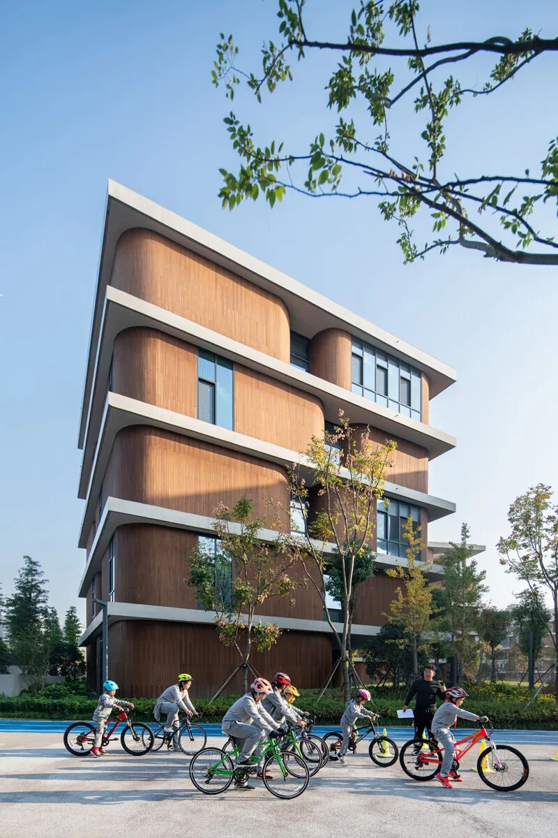 由暖色竹木包裹的立方体建筑群是小学和中学的教学楼。小学的教学立方外墙采用曲线的转角,而中学则是直角。