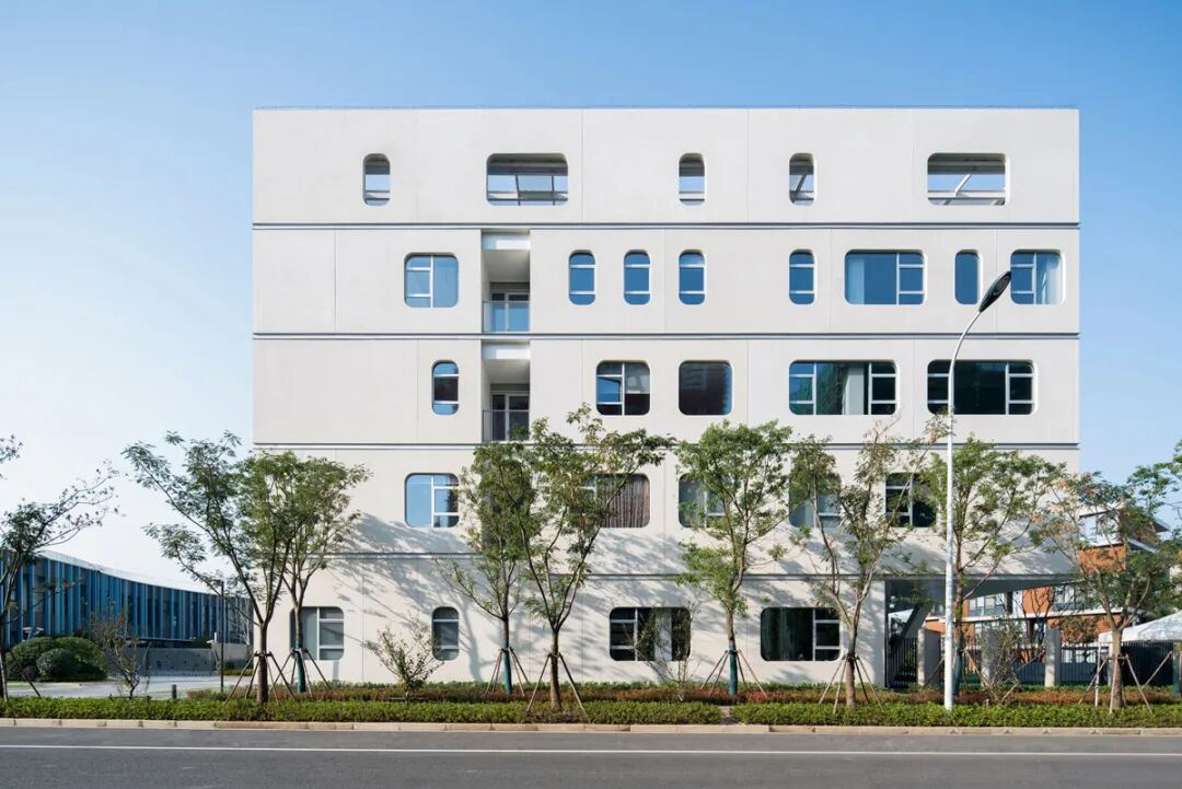 一座拥有胶囊形窗洞的白色预制混凝土建筑是行政实验楼。花园、湿地、森林、山丘、跑道和大大小小的运动场,将校园变成了一个健康新陈代谢的生态系统。建筑和景观一道,形成丰富、充满变化的物理环境,伴随孩子们的成长。