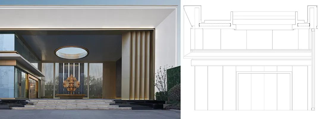 我们以大手笔刻画门厅,8米挑高、12米间宽,形成了大气的前场空间。后期在零拆改的条件下,使社区出入口透露出“高门显第”的气韵。