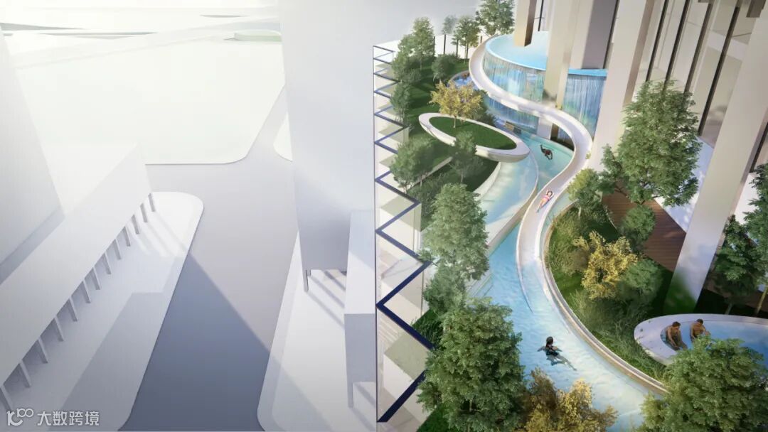 在塔楼中段,由于办公楼层到酒店楼层的功能转换,核心筒进行了收缩,建筑形体结合避难层由南至北退让出露台。露台区域上部挑空,12m的层高打造了一个广州独一无二的立体丝带泳池,并与上层空间联通打造空中大堂空间。泳池与绿化露台包裹空中大堂,营造出跳脱有趣但毫不违和的半空庭院,为住户提供了一种全新的生态休闲的城市生活体验。