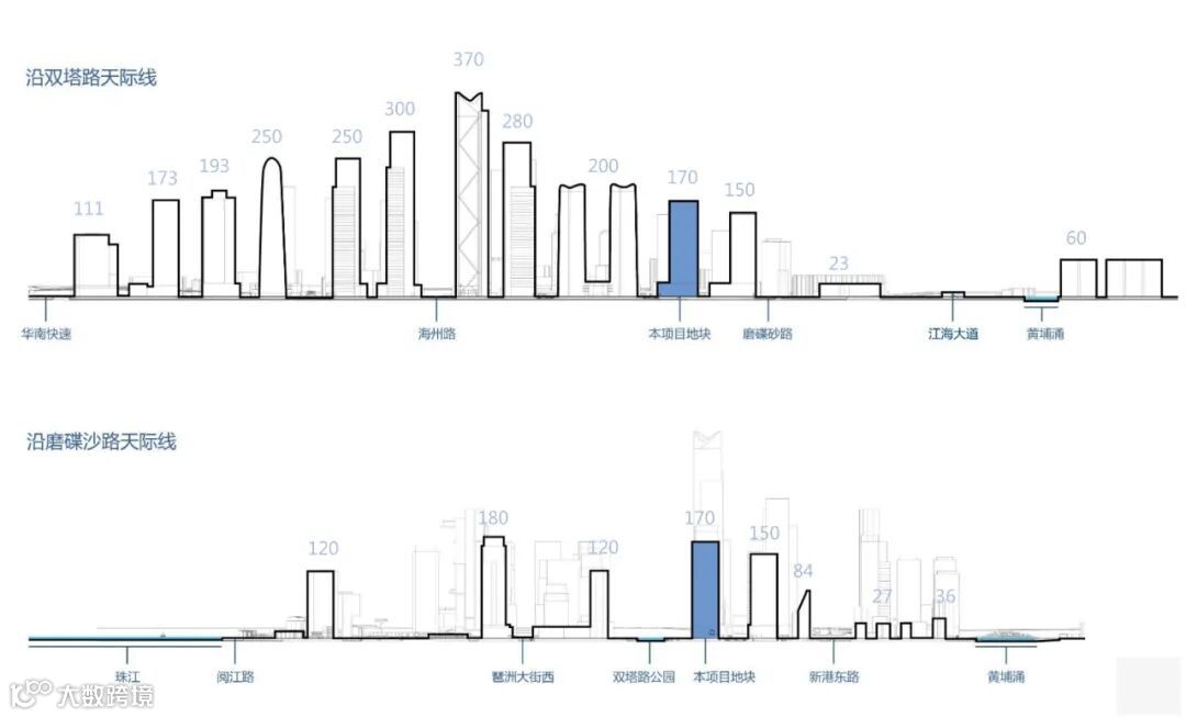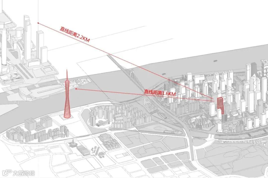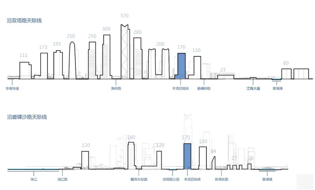 在琶洲整体城市设计与规划条件中,地块建筑高度被限制在170米,相较于周边为数众多的200米甚至300米以上的塔楼,本案在整个轴线上并不占有高度优势。