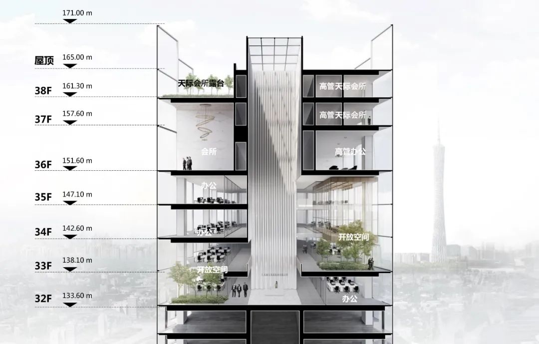 沿垂直中庭不同标高分布了大小不一的水平庭院,沿庭院布置办公、会议等空间,使不同标高的空间与视线能联系紧密且丰富活跃。最顶部的屋顶设置了天际露台,有天有地,形成世外桃源般的城市办公总部场所。