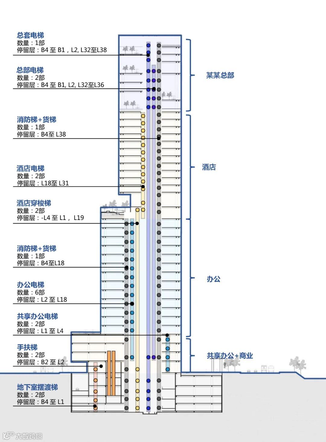 塔楼的功能布置由垂直方向划分,依据公共性与空间需求,由下至上布置共享办公、办公、酒店以及总部,并且为总部办公、办公及酒店各自设计了独立的电梯厅与穿梭梯,核心筒向上逐步衰减,以保证各类功能交通的独立性与经济性。
