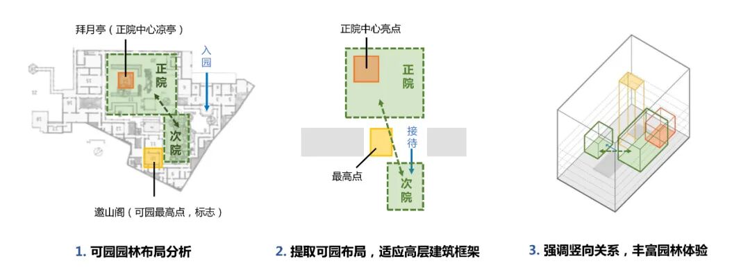 总部办公的空间组织方式由岭南园林空间抽象演绎而来,我们提取了岭南四大园林之一 “可园”的空间要素,研究其庭院空间水平与竖向的组合。依据其中竖向要素统领水平空间的组合形式,在总部办公空间中设置30米挑空的垂直中庭,室内沿用立面“流水”倒悬的形式,呼应整体。
