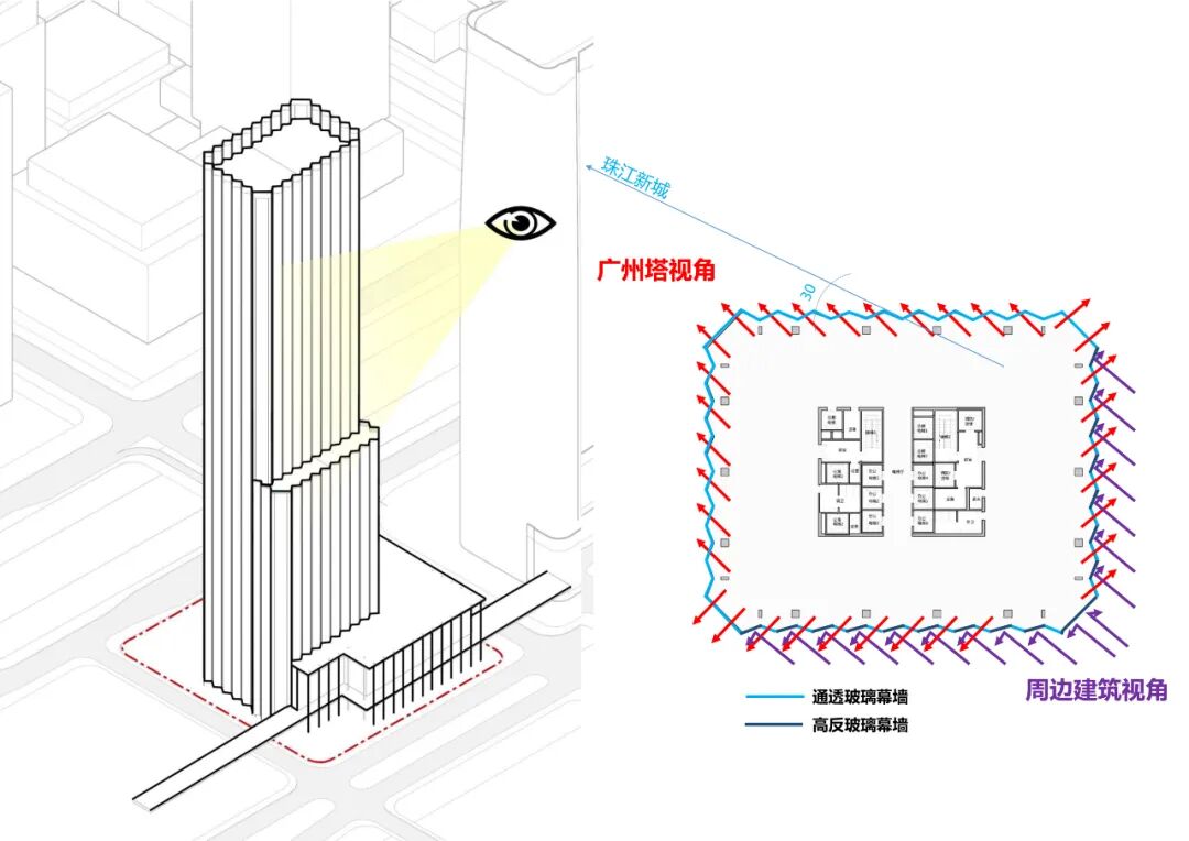 形式之外,塔楼折面的介入也自然地分隔了室内视线,将视线引导至视野最佳面广州之心。裙楼细柱支撑大屋顶,形成遮阳系统,适应广州气候条件的同时,也成为岭南传统骑楼的一种现代演绎。