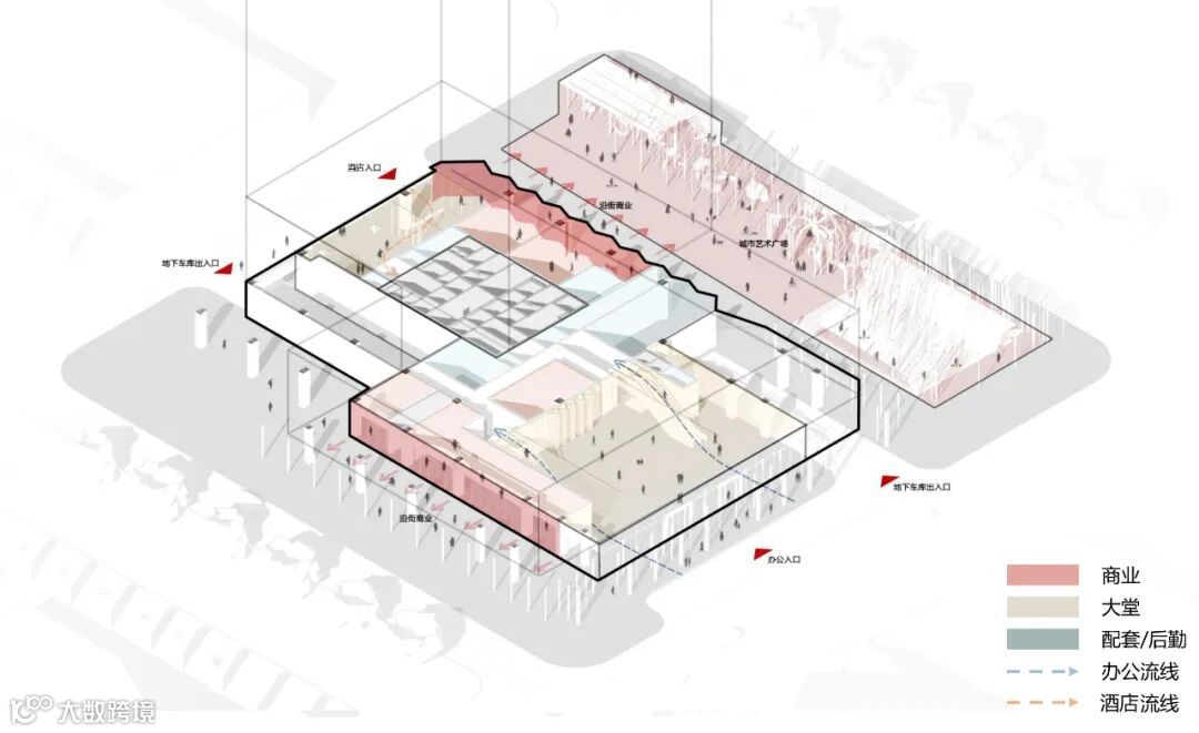 裙楼部分作为人流汇集重点区域,交通复杂。为了处理好酒店、办公及总部的关系,将酒店入口独立布置于西侧,而办公和总部则共享东侧主要入口。在大堂二层,方案设置总部的独立前厅,满足其功能的独立性与完整性。