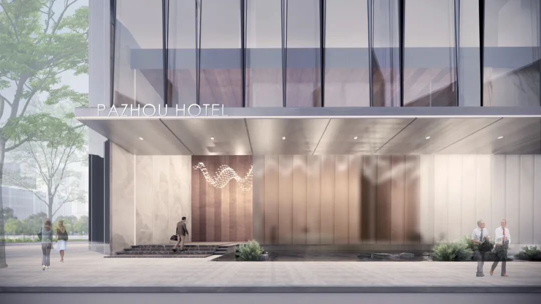 旅居与办公作为两类完全不同属性的行为,需求各异。为了提升酒店的品质感与私密性,我们将酒店入口独立布置于建筑西侧,入口的大堂落客区由磨砂U型玻璃分隔室内外,由外往内望去,隐约透出室内的暖色材质,营造空间的半透明性与私密感。