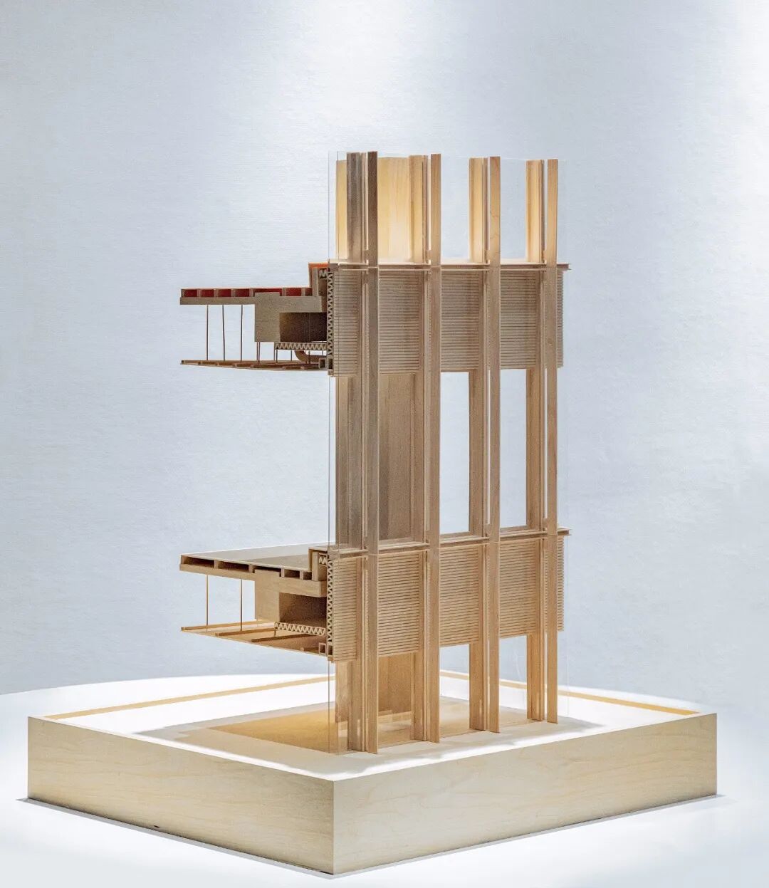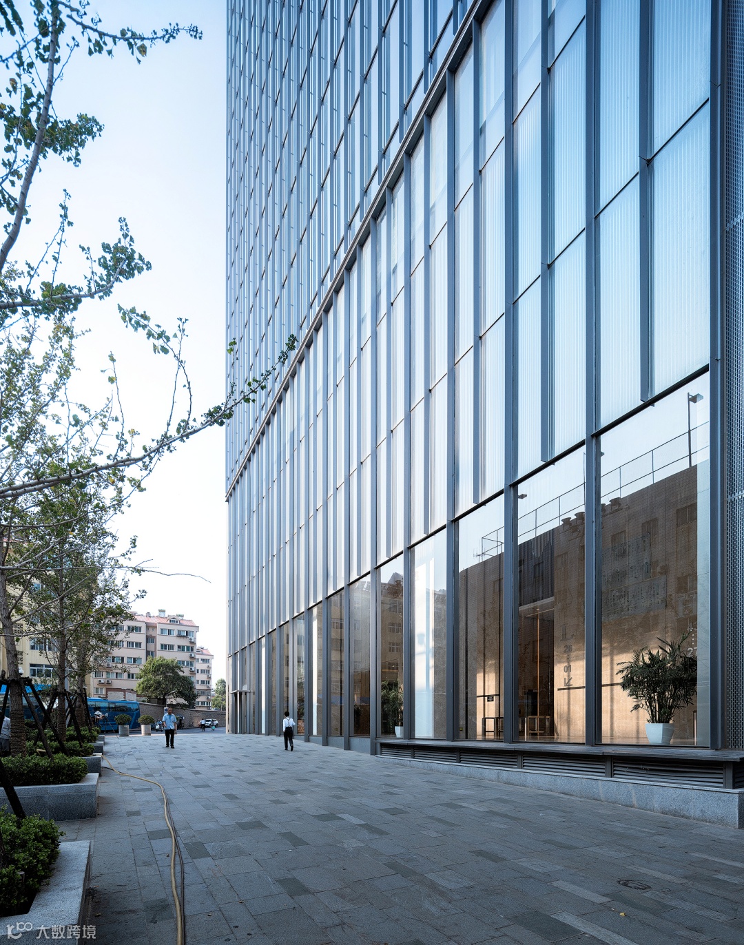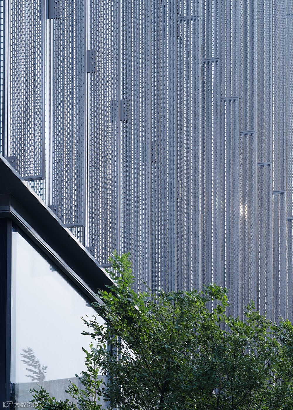 建筑表情则进一步回应建筑的整体感与延展性。外立面被赋予简洁竖向的金属线条,与建筑玻璃材质紧密贴合,平添一层精确推敲的阴影关系,在丰富建筑表情的同时,近人尺度上弱化建筑体量带来的压迫感,营造谦逊宜人的临街界面。