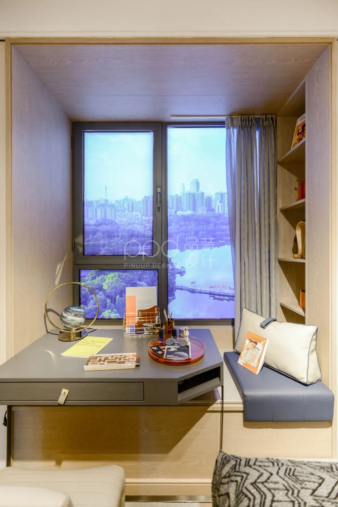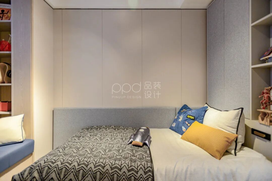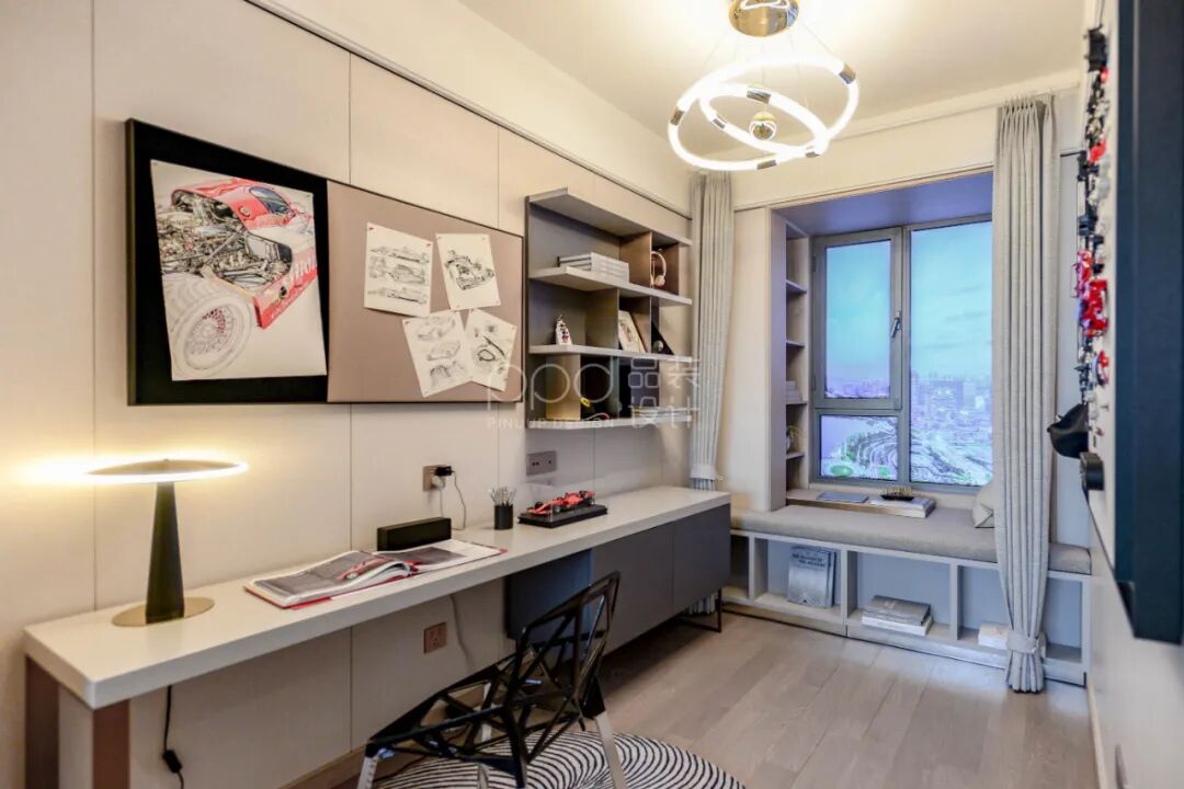书房:本案将其中一间房打造成了一间个性化书房,将墙面充分利用,收纳功能与墙板相连的一体化设计不仅可以扩大书房的收纳空间,同时也避免了置物架掉落的危险,更加安全。居住者可以在这个空间内尽情展示自己的爱好,将其打造成独具个人风格的私人空间。