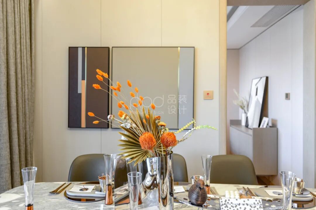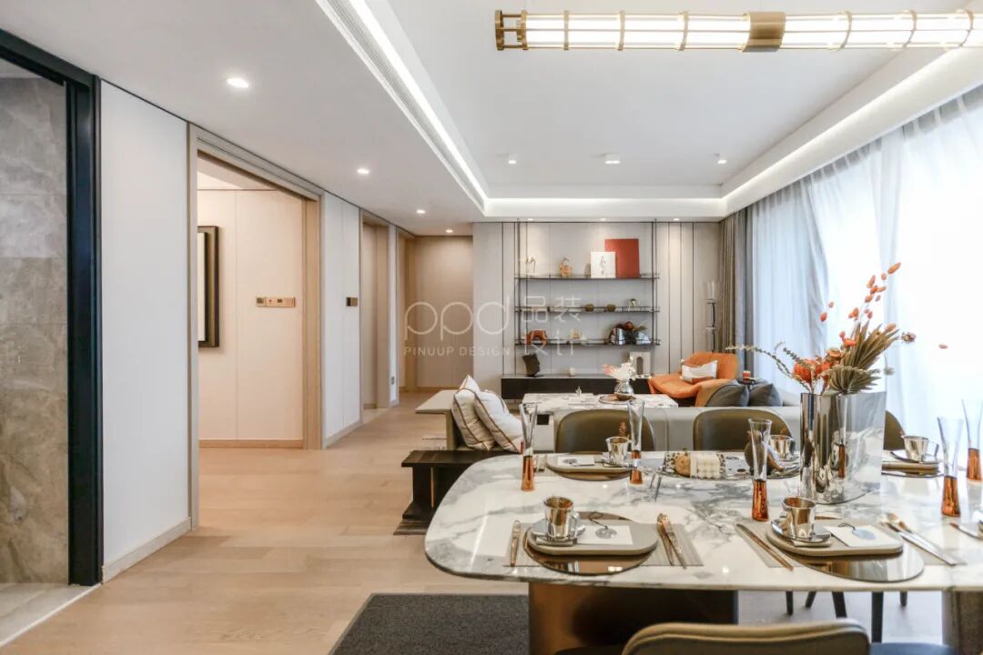 设计师也十分尊重建筑自身条件,采用大开间+大面积阳台的设计充分将自然光带到室内,结合室内无主灯的灯光设计,营造舒适而自然的生活场景。同时巧妙的运用玻璃、金属线条、橙色软装等元素来拓宽视觉感受,在时尚、轻奢中找寻舒适自然的生活节奏,既精致又有态度,更符合本案浪漫、优雅的“漫”生活定义。