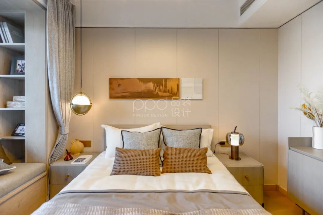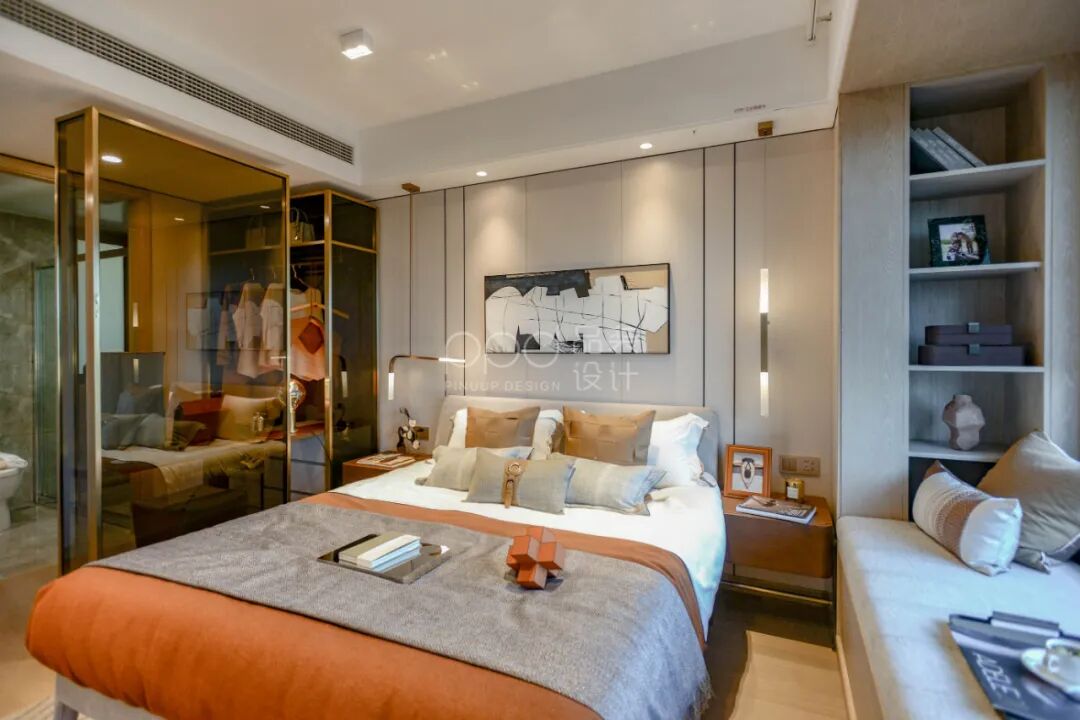 主卧:主卧空间以简雅的素色基调营造宽敞明亮视觉感,以橙色的软装陈设拉开空间层次,同时配合适当的金属线条,让整个卧室空间既时尚又不失轻奢质感,展现了居住者对生活品质的要求。主卧内包含睡眠区、衣帽间、卫浴间以及飘窗四个部分,功能完备,空间充裕,能够充分满足休息、娱乐、梳妆、洗浴等多重需求,空间的使用效率和舒适度都得到了大幅提升。