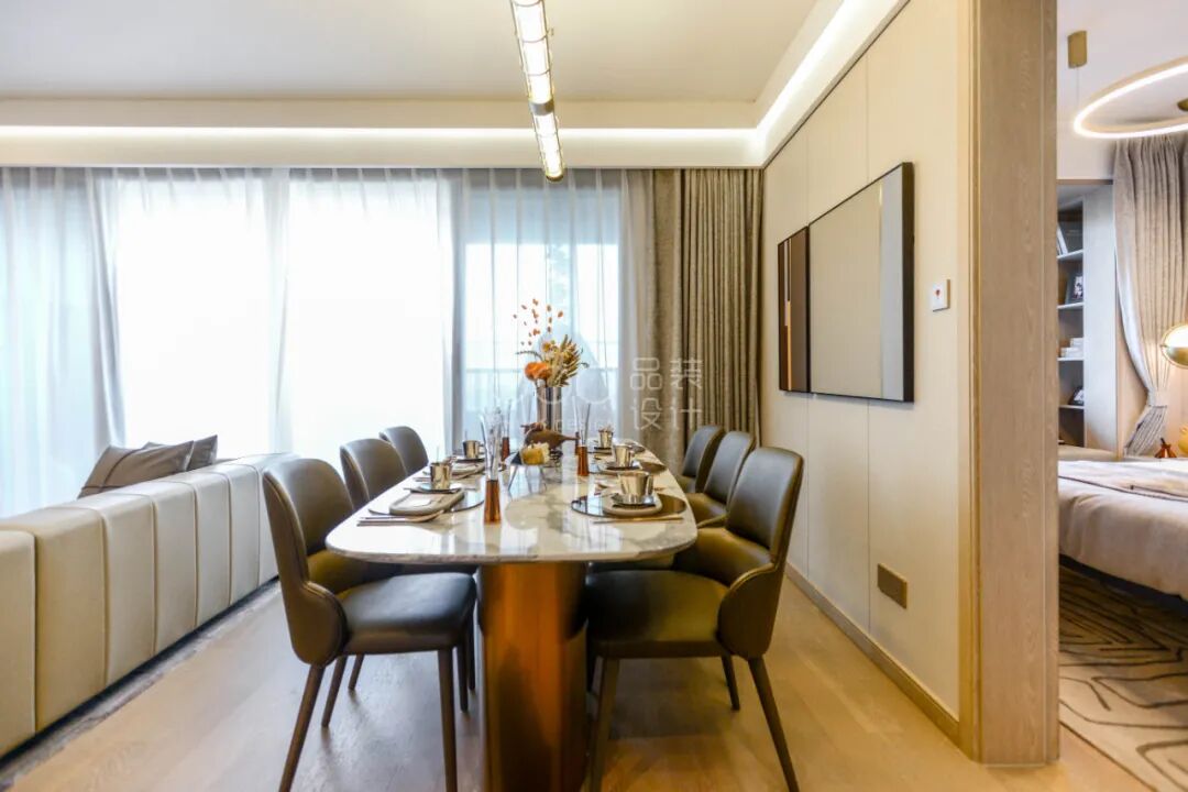 作为整个室内的核心区域,颜值与功能都不能忽略。除了满足会客、用餐的功能需求外,大空间的收纳也尤为重要。对此,PPD品装设计的设计团队巧妙的将客厅背景墙打造成一面收纳展示墙,将装配式集成墙板与收纳层架相结合取代了传统的电视墙,实现功能性、美观性双效提升。