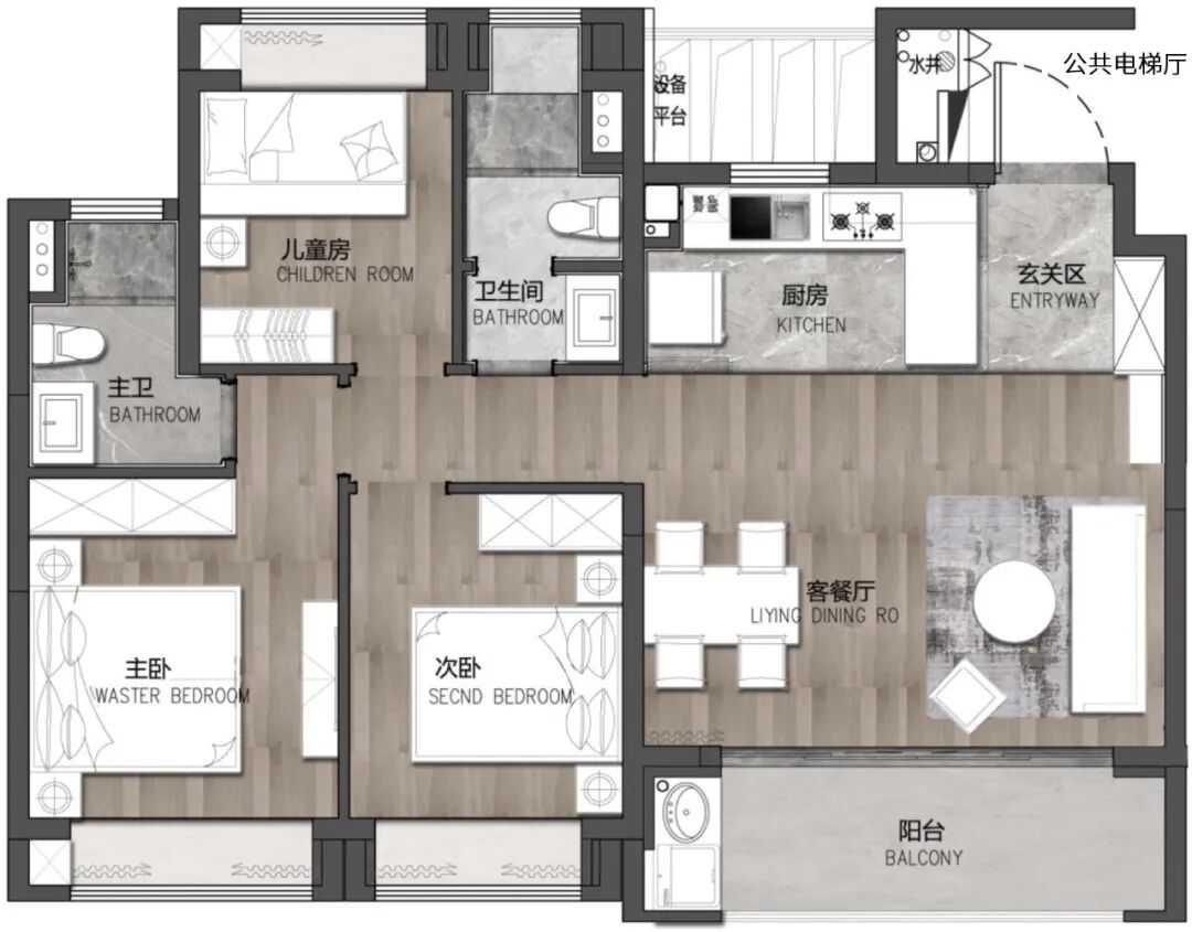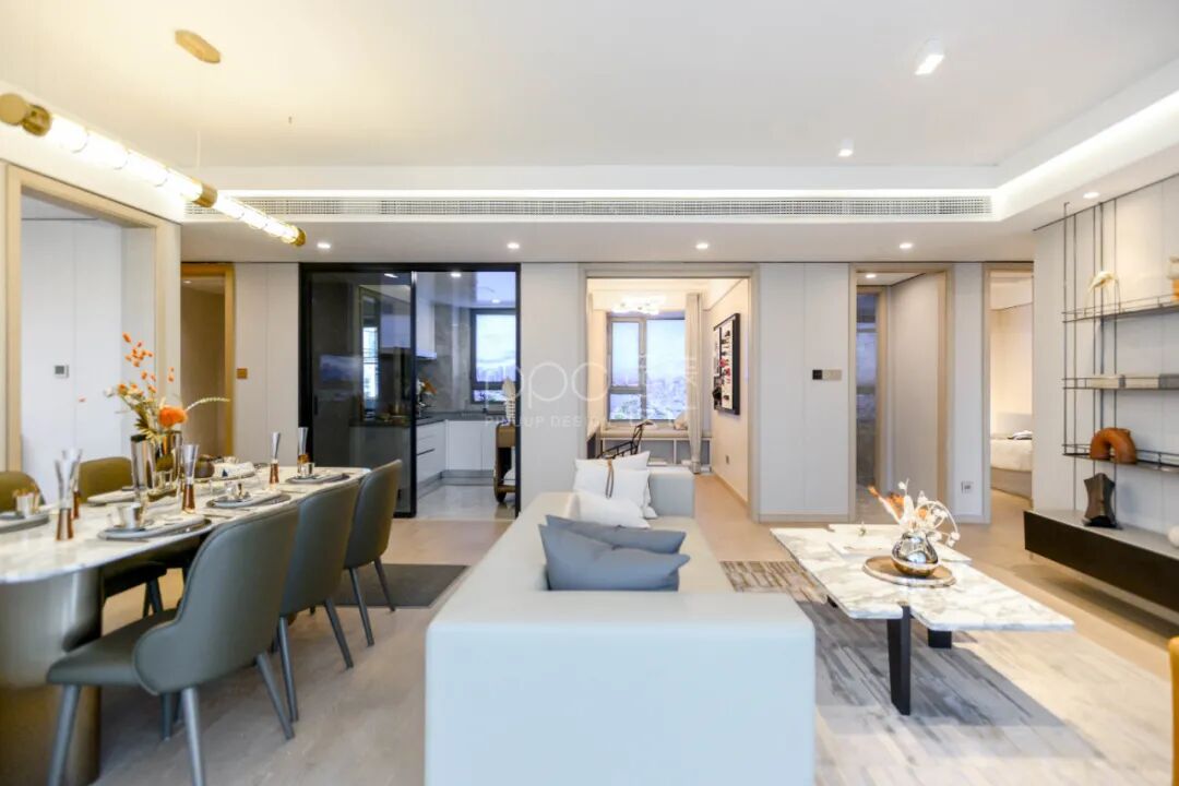 在室内设计上,PPD品装设计团队采用了有别于传统装修的装配式内装设计,将现代简约、去繁从简的设计理念搭载标准化、工业化的革新内装工艺,重新定义现代都市人群的艺术与优雅,使产品的交付效果相较于传统装修实现了整体性的大幅提升。下面就以建面约118㎡的四房两厅两卫的户型为例,一起走进装配式内装打造的新世界。