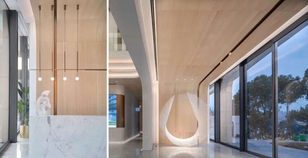 门厅作为主厅的前奏,设计师适当压低了空间,并且以白色洞门作为软性分隔,形成框景。空间两端,软装布置了两组“鹭”主题的雕塑作品,相和互鸣,埋下伏笔。