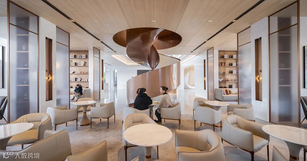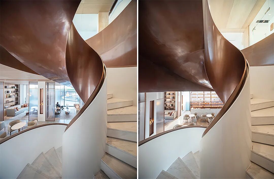 沙盘区侧面的古铜色旋转楼梯, 是重要的视觉元素,指引动线从主厅走向洽谈区,扭动与断续中,丰富了空间层次。