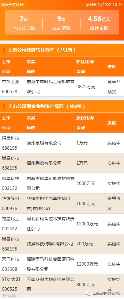 2022年10月21日,资产交易成交金额4.56亿元,上市公司7家,成交9笔,上市公司挂牌转让资产1笔,上市公司现金收购资产8笔。