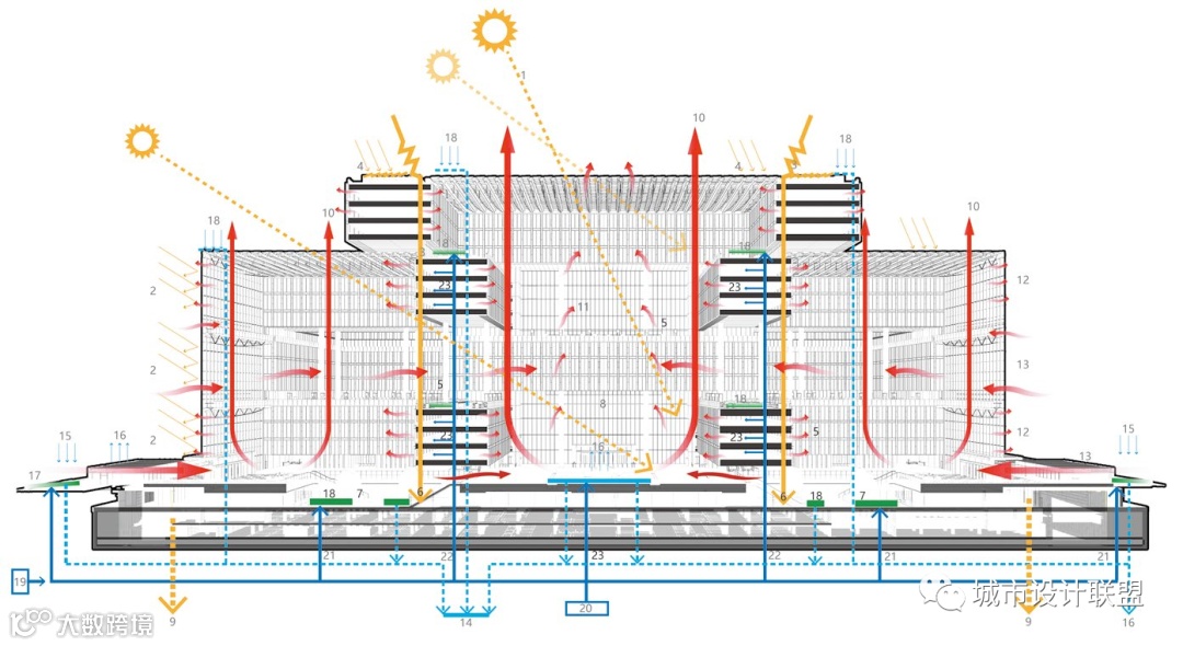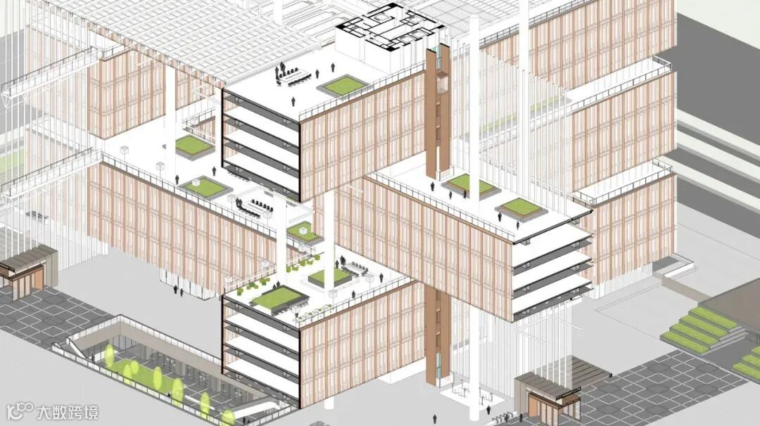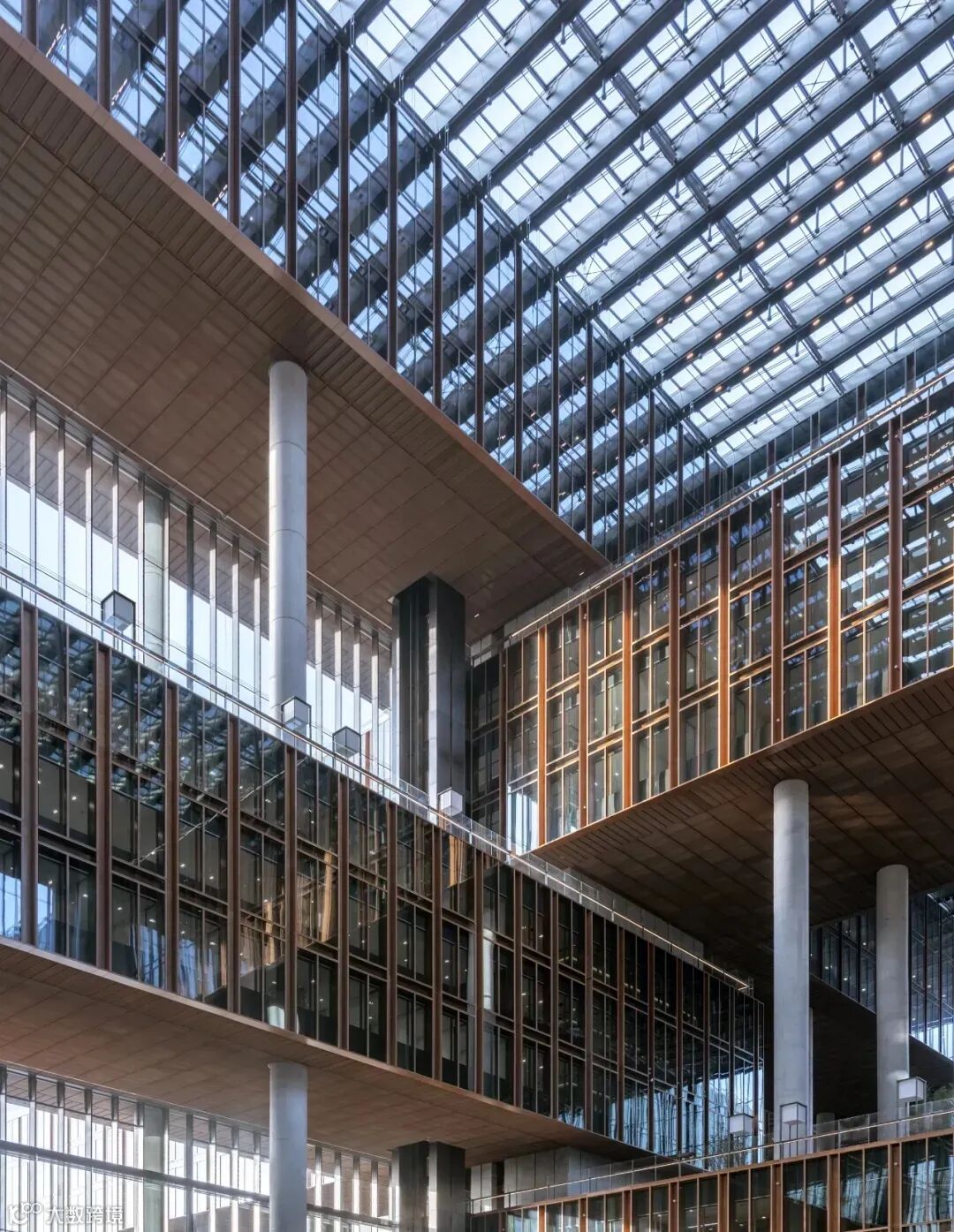 为了进一步提升内部工作空间的开放性和透明度,办公体量每隔4 层移动一次,以类似于中国传统木结构“ 叠梁” 的构造方式进行叠加,在9 个庭院之间营造了一种引人入胜的连续空间,提供了更多的自然采光,并构成了不同的建筑部分之间朝向室外的多重景框。