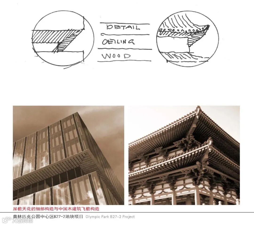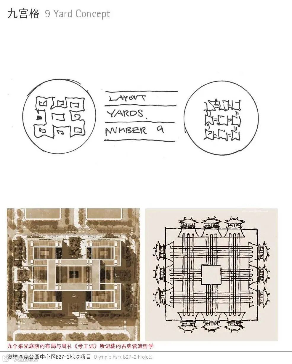 它是由水平的每三层为一组的体量单元相互层叠组成的,由凹槽分隔开。这是对中国建筑重檐屋顶的一种暗示,但并不是对它的简单复制。