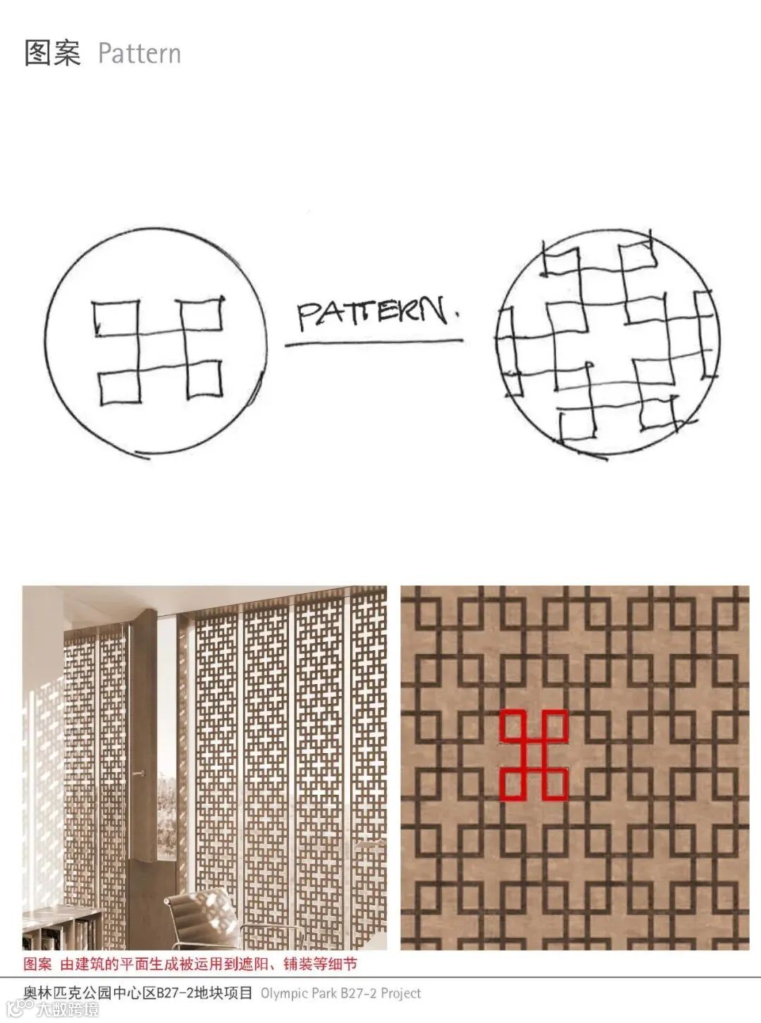 为了解决办公空间的遮阳,我们设计了一种相互联动的遮阳系统,像一种小尺度的折叠墙。墙体由特殊定制的镂空金属板构成,纹样取自建筑的平面布局,令人联想到中国古建筑的木花窗,是一种现代化的演绎。